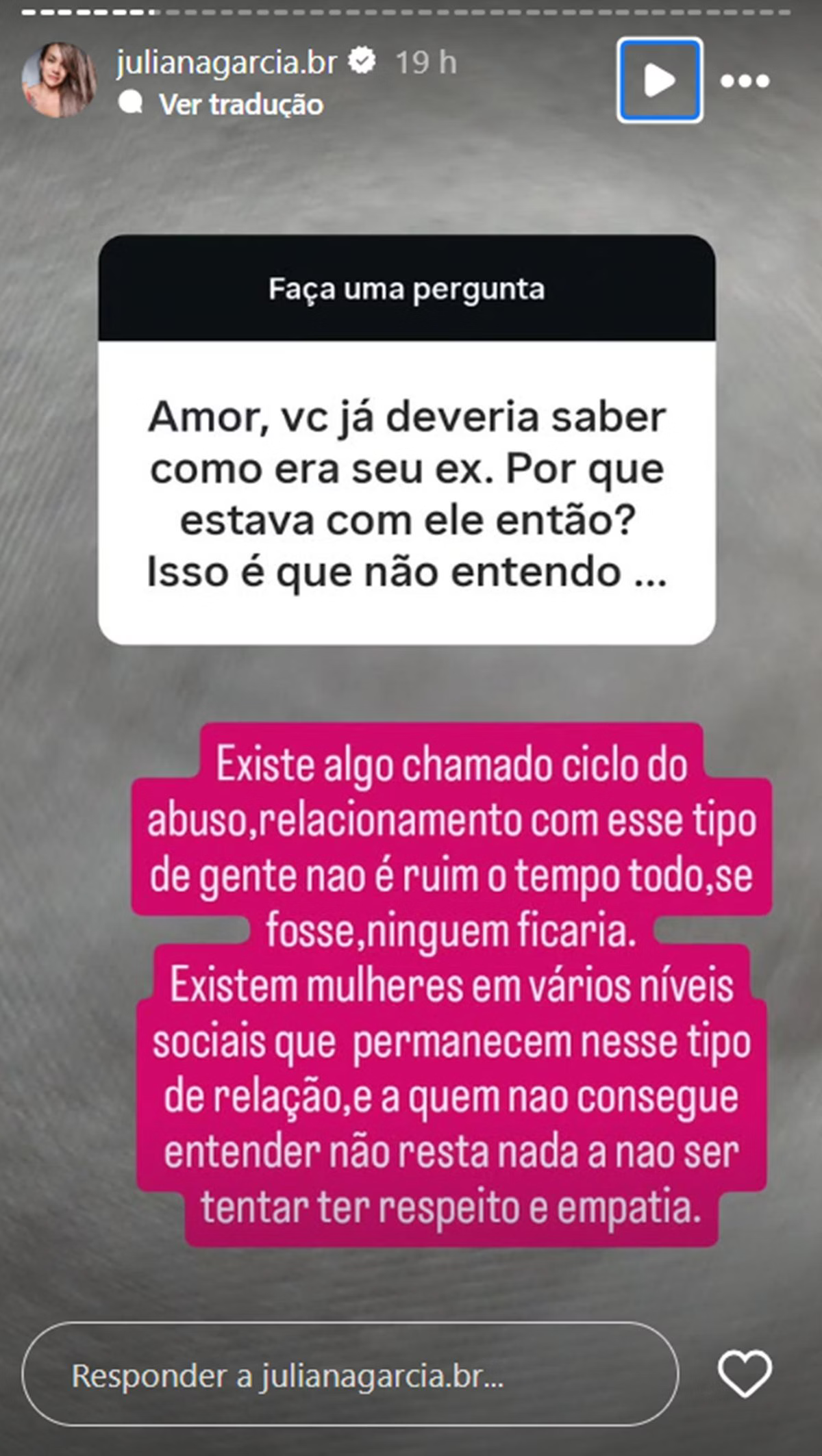 Respondendo a perguntas de seguidores no Instagram, Juliana explicou por que não deixou o relacionamento antes da agressão. Segundo ela, o convívio com Igor não era ruim o tempo todo, o que a fez permanecer na relação. Ela destacou que esse comportamento faz parte do ciclo de abuso, comum em relacionamentos violentos, e pediu empatia para quem não compreende essas situações.