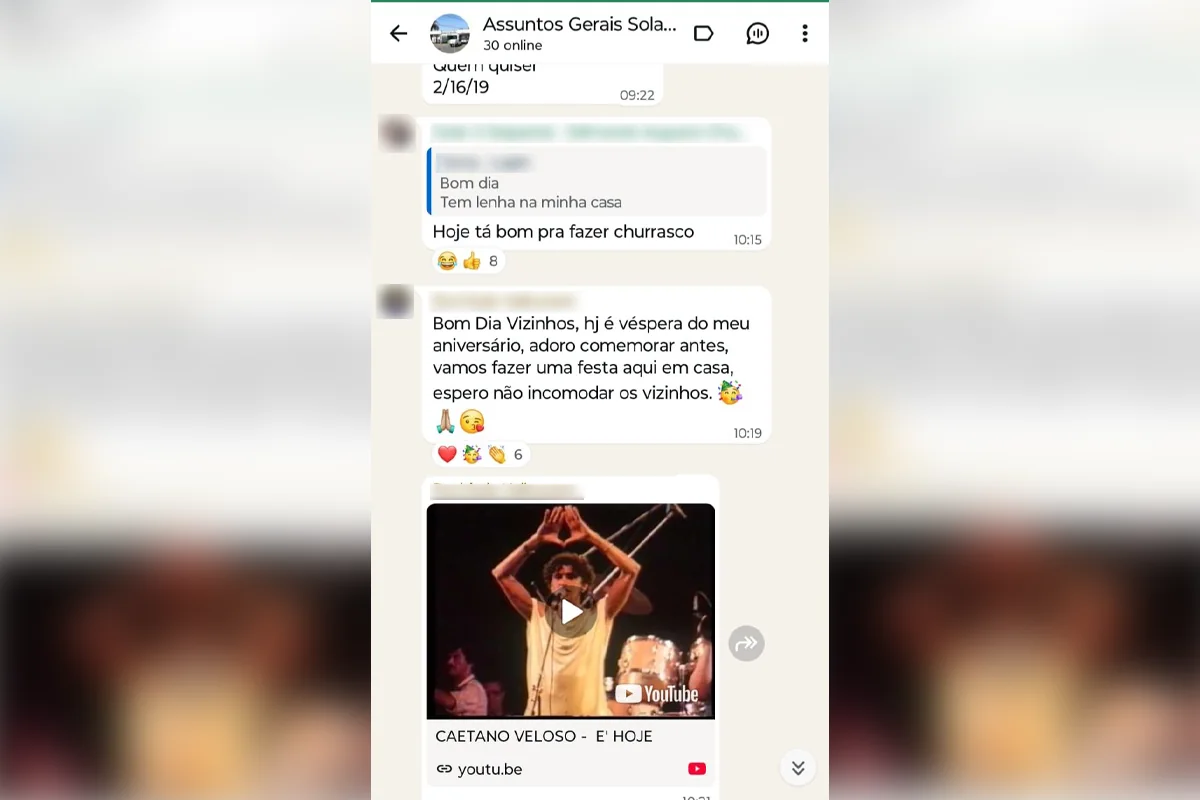 Minutos depois, um dos moradores compartilhou no grupo a música “É hoje”, famosa na voz de Caetano Veloso, destacando o trecho “Diga, espelho meu, se há na avenida alguém mais feliz que eu”, em tom de celebração. A postagem reforçou o clima festivo entre os que se opõem ao ex-presidente.
