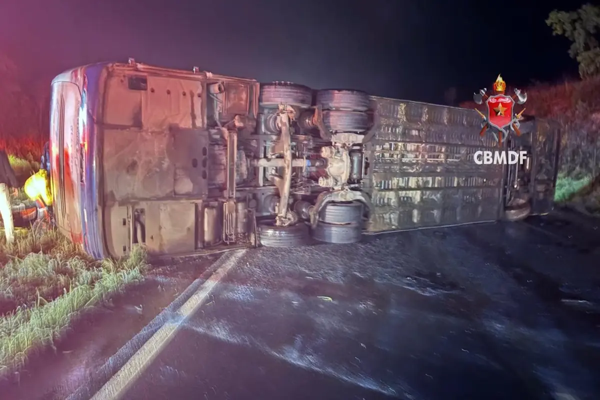 Um acidente grave envolvendo um ônibus de viagem e um caminhão guincho deixou 27 pessoas feridas na noite de domingo (23/11), na BR-020, próximo a Planaltina, no Distrito Federal. Três vítimas apresentavam ferimentos graves, sendo duas com perda de consciência e uma suspeita de fratura no fêmur, segundo o Corpo de Bombeiros Militar do Distrito Federal (CBMDF).