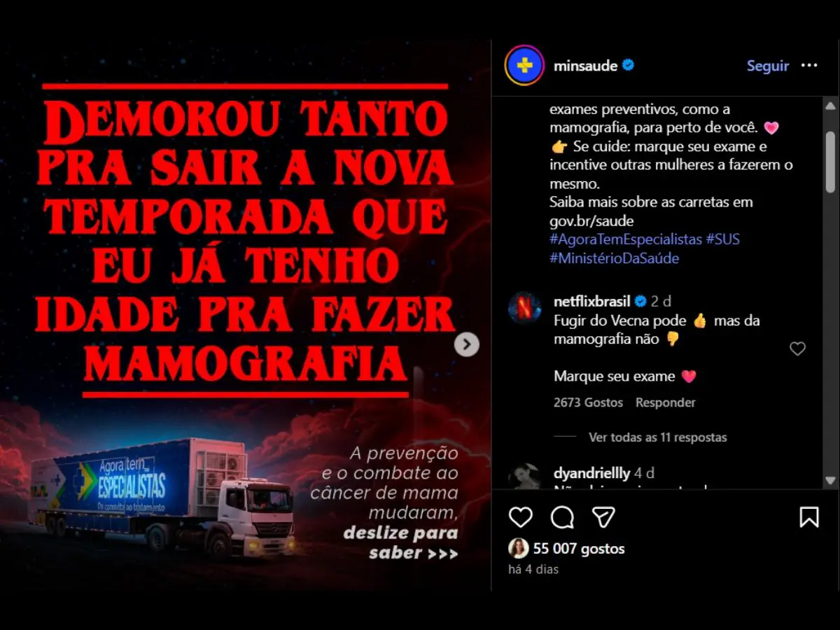 O post viralizou rapidamente, não apenas pelo conteúdo informativo, mas também pela abordagem criativa e envolvente. A Netflix, plataforma responsável pela série mencionada, interagiu com a publicação de forma bem-humorada: “Fugir do Vecna pode, mas da mamografia não. Marque seu exame”. A resposta rendeu ainda mais engajamento, com mais de 55 mil curtidas e mais de mil comentários e compartilhamentos.