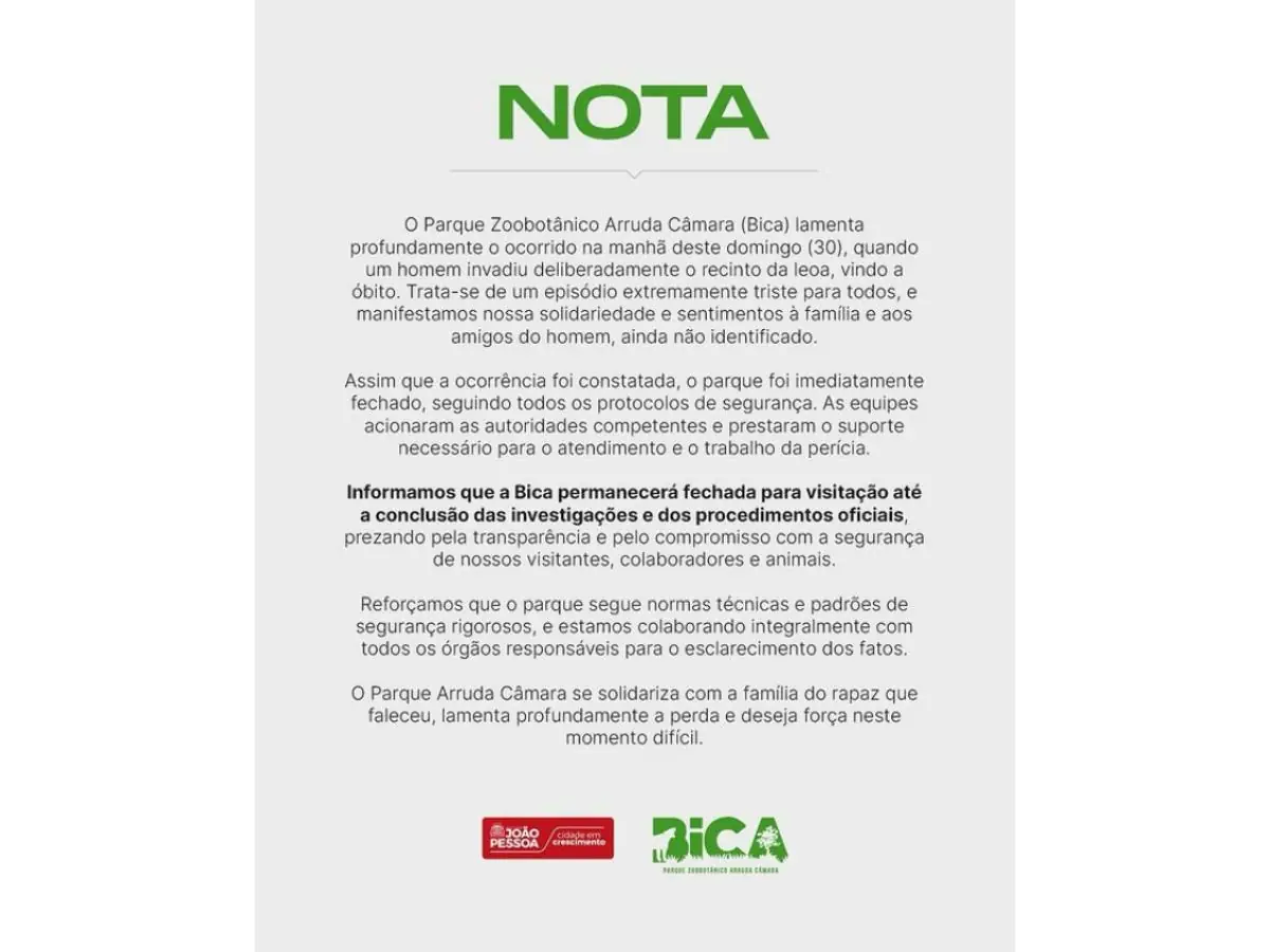 Gerson de Melo Machado, conhecido como “Vaqueirinho”, morreu no último domingo (30/11) após invadir a jaula de uma leoa no Parque Zoobotânico Arruda Câmara, em João Pessoa (PB). Antes do trágico episódio, o diretor da Penitenciária Desembargador Flósculo da Nóbrega, Edmílson Alves, já havia alertado sobre a condição mental do jovem, que era ex-detento da unidade.