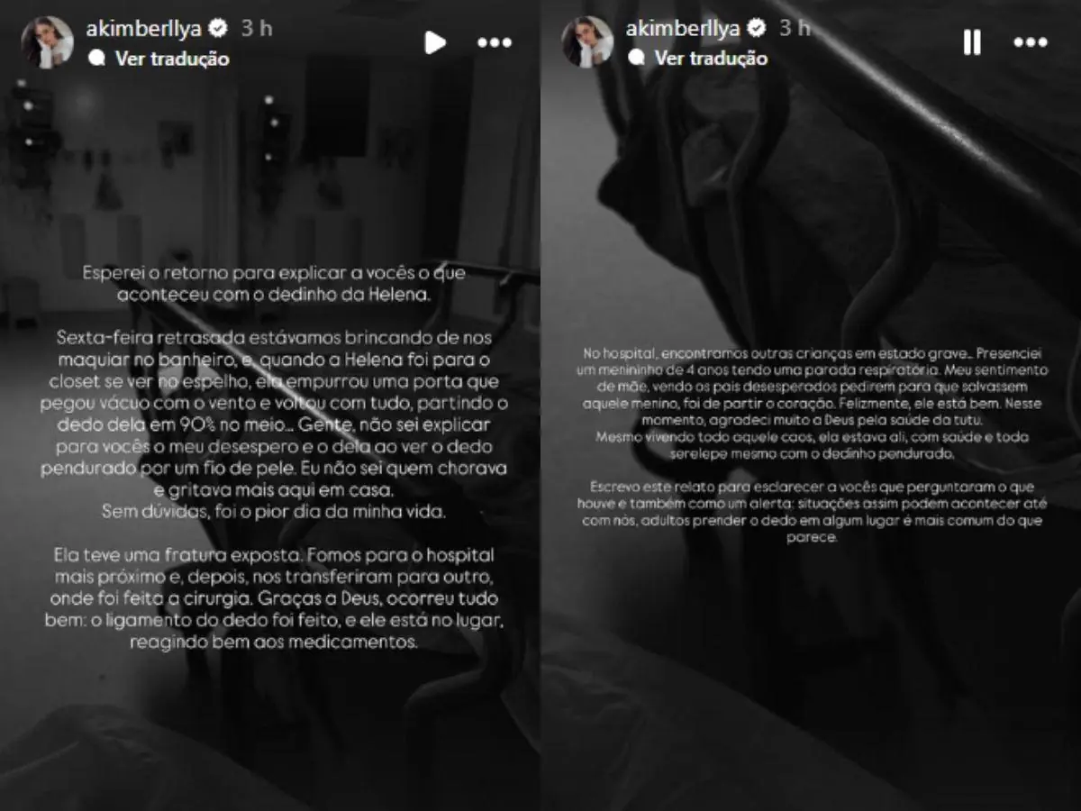 Amanda também detalhou o momento do acidente, ocorrido durante uma brincadeira em casa. Segundo ela, Helena entrou no closet para se ver no espelho e empurrou uma porta, que voltou com força devido ao vento e atingiu seu dedo, quase o partindo ao meio. A influenciadora descreveu o desespero que sentiu ao ver o dedo da filha “pendurado por um fio de pele”, classificando o episódio como o pior dia de sua vida.