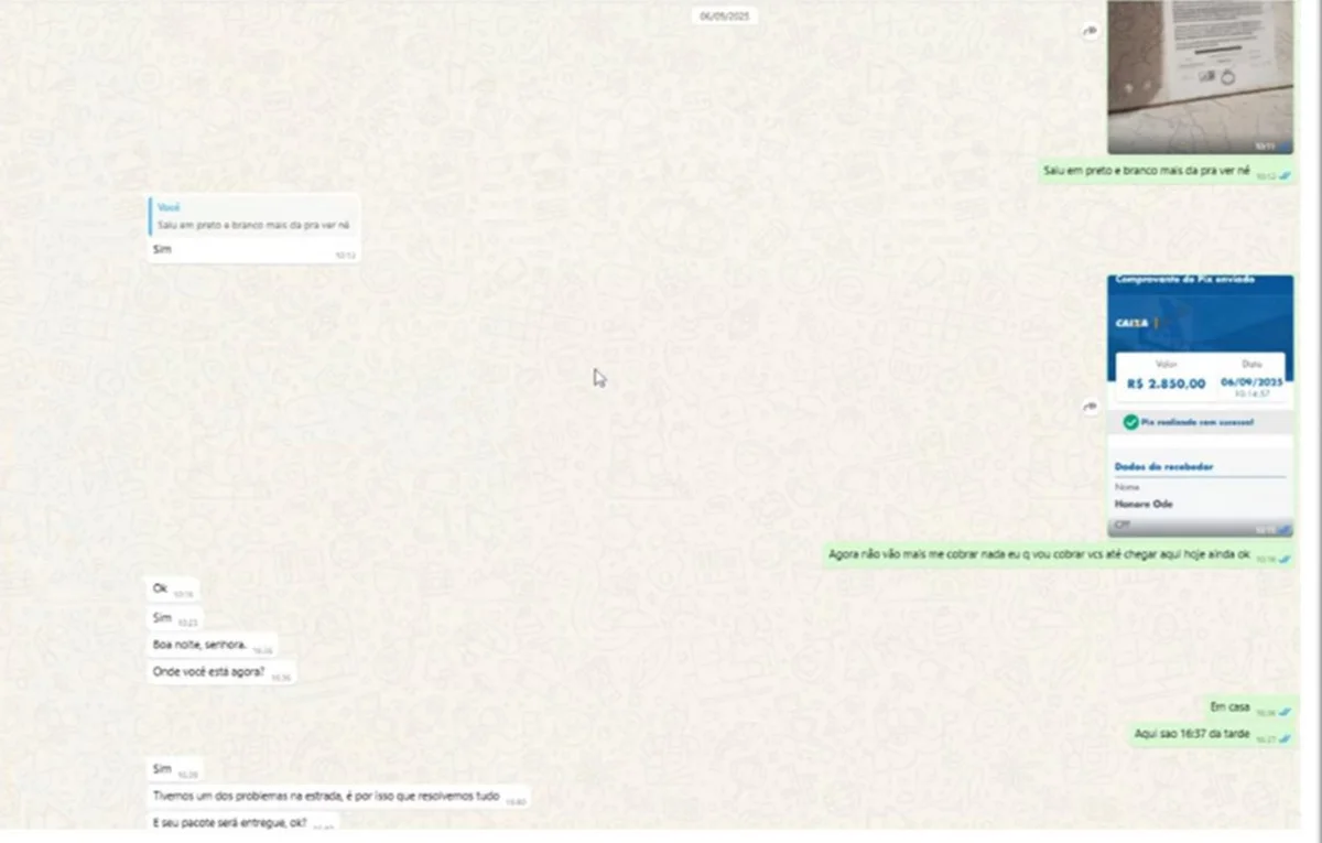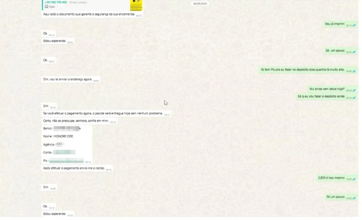 As transferências incluíam valores como R$ 2,85 mil para “envio internacional”, R$ 1,5 mil por um suposto acidente com o caminhão da entrega e R$ 1,35 mil para uma “entrevista obrigatória”. Outros pagamentos foram feitos sob pressão emocional.