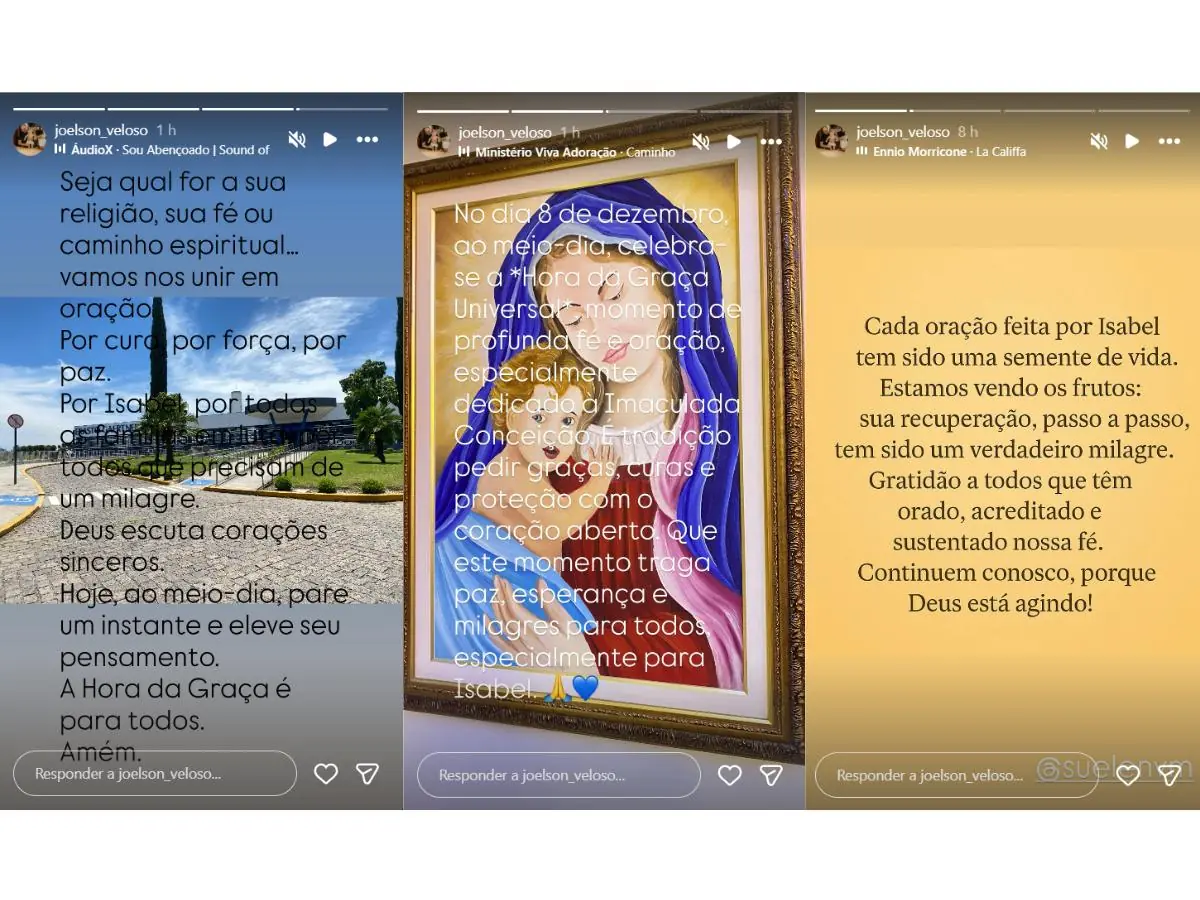 Nesta segunda-feira (8/12), data em que a Igreja Católica celebra o dia da Imaculada Conceição, o pai de Isabel, Joelson Veloso, fez um apelo nas redes sociais pedindo orações por um milagre. Ele convocou seguidores de todas as crenças a se unirem em oração ao meio-dia, horário tradicionalmente associado à “hora da graça”, momento de fé e pedidos espirituais.