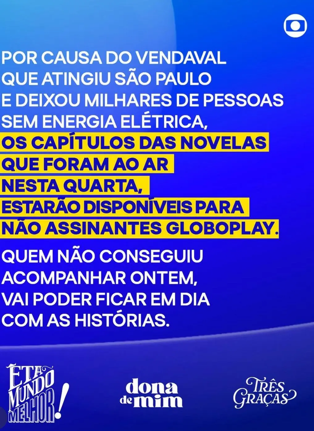 Após um forte vendaval que atingiu São Paulo na última quarta-feira (10/12) e deixou cerca de 2 milhões de pessoas sem energia elétrica, segundo a concessionária Enel, a TV Globo decidiu liberar gratuitamente os capítulos das novelas exibidos naquele dia no Globoplay. A medida foi anunciada pela emissora em suas redes sociais como forma de permitir que os telespectadores afetados pela queda de energia pudessem acompanhar normalmente a programação.