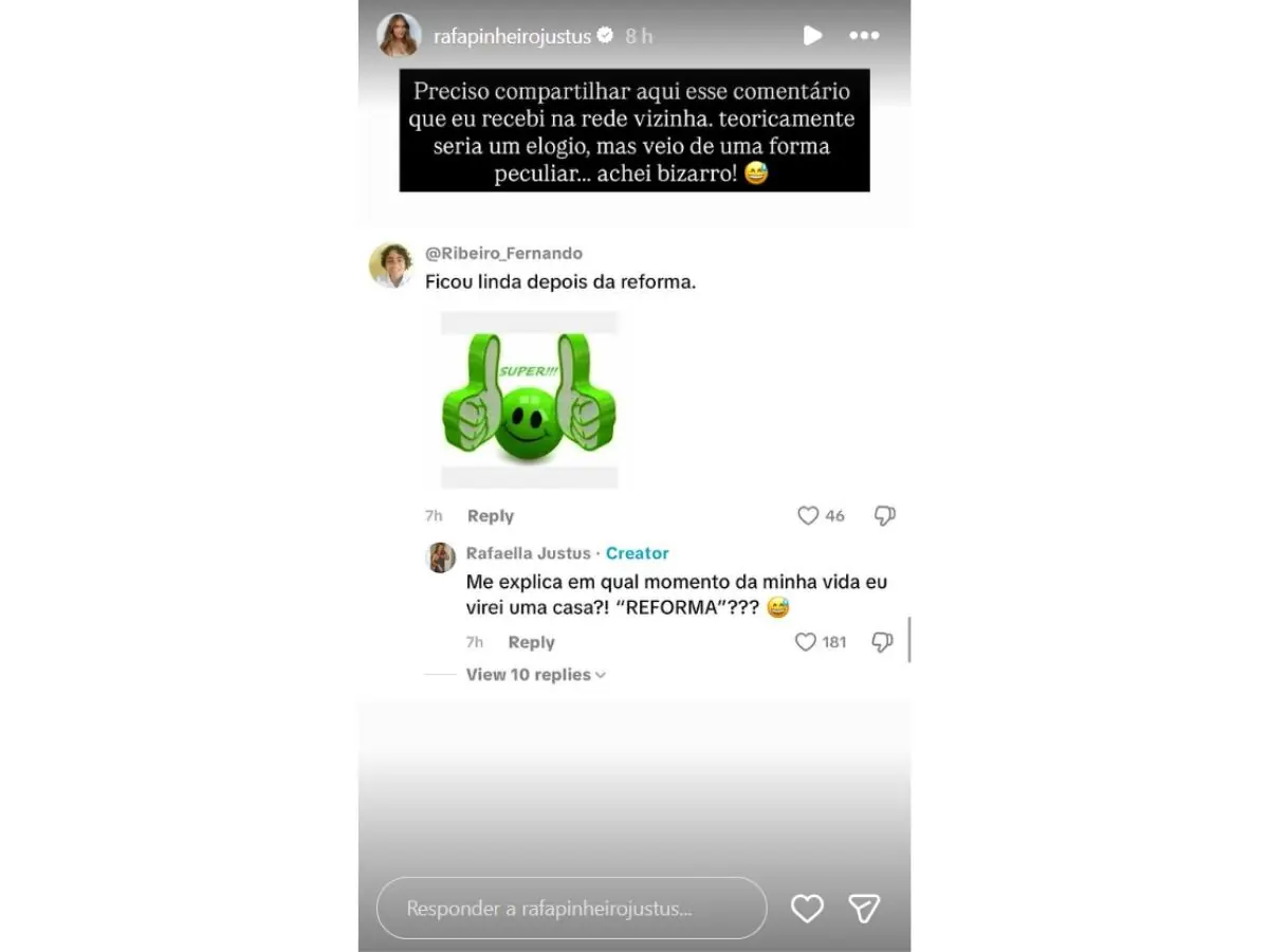 O comentário dizia: “Ficou linda depois da reforma [com um emoji de joinha]”. Em resposta, Rafa publicou um vídeo no TikTok questionando o termo usado: “Me explica em qual momento da minha vida eu virei uma casa?! ‘REFORMA’???”. A influenciadora também compartilhou um print da mensagem em seu Instagram, reforçando a estranheza com o suposto elogio: “Preciso compartilhar aqui esse comentário que eu recebi na rede vizinha. Teoricamente seria um elogio, mas veio de uma forma peculiar… achei bizarro”.