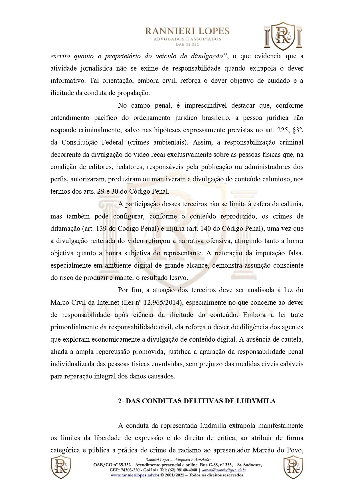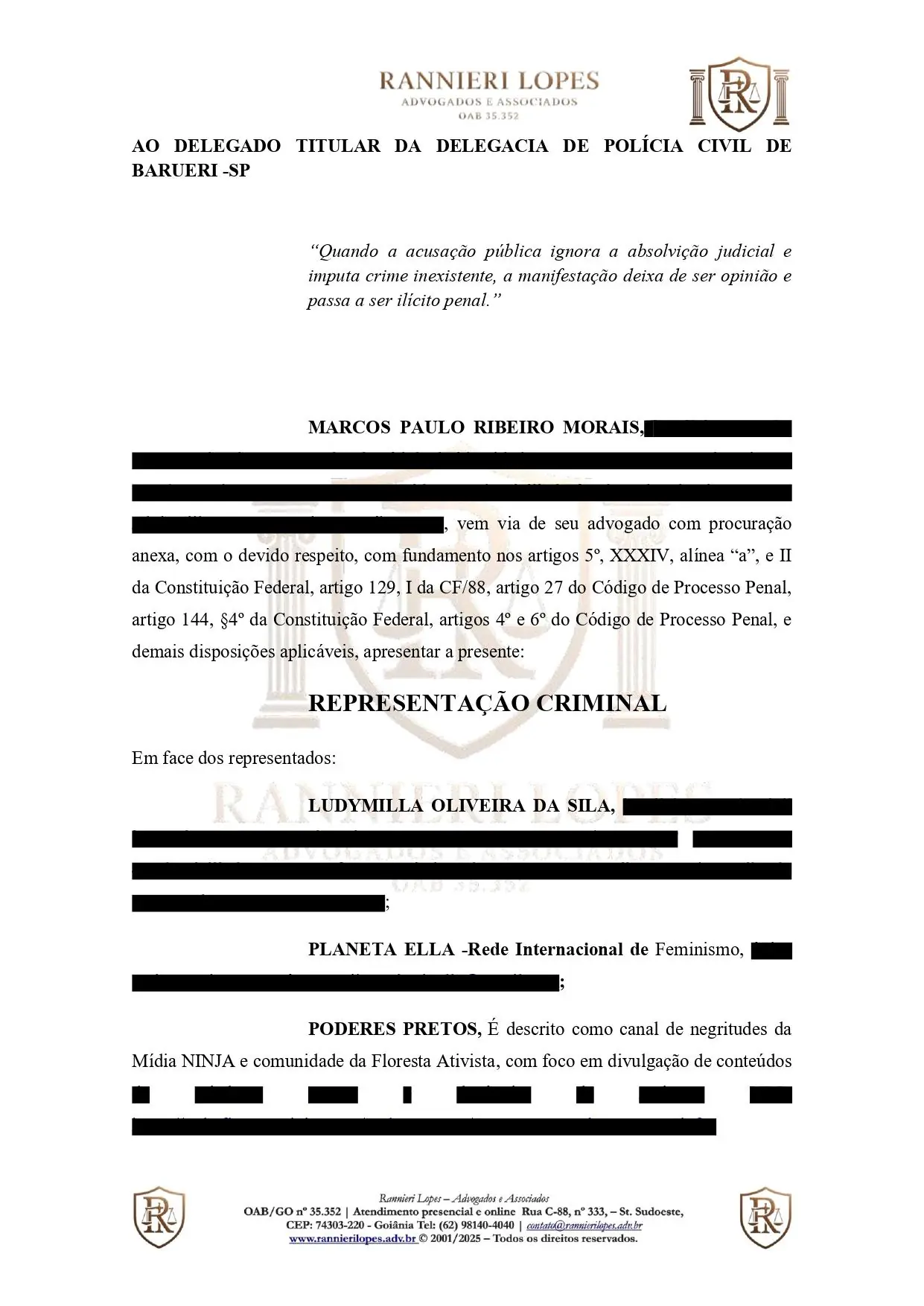 A representação ainda acusa Ludmilla de calúnia, difamação e injúria, e solicita medidas para evitar o “linchamento público digital” decorrente da divulgação repetida do conteúdo considerado calunioso.