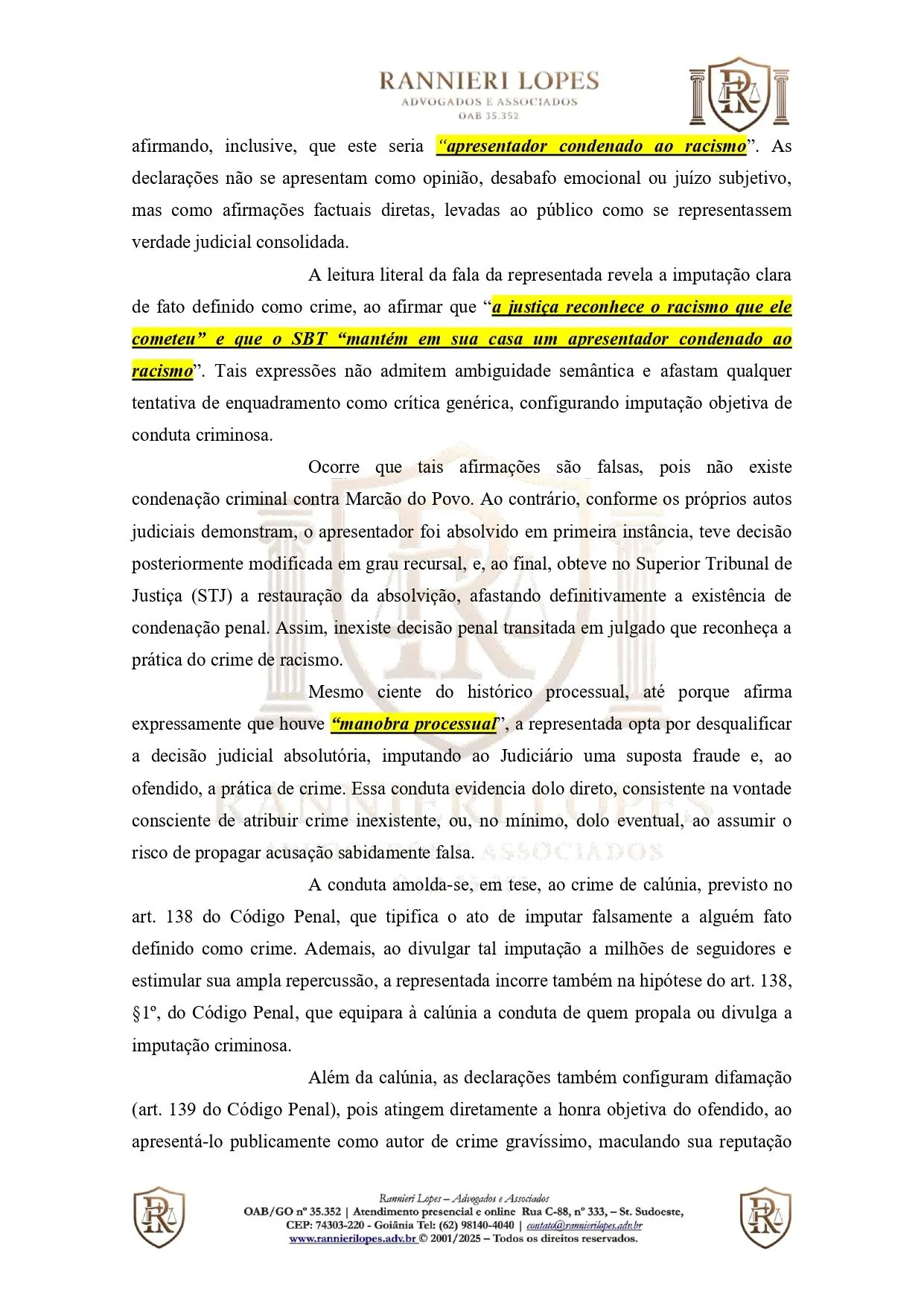 Para a defesa, a manifestação de Ludmilla ultrapassou o direito de crítica, pois se tratou de afirmação factual contra Marcão, apresentada como se houvesse sentença definitiva, e não apenas opinião pessoal ou comentário emocional.
