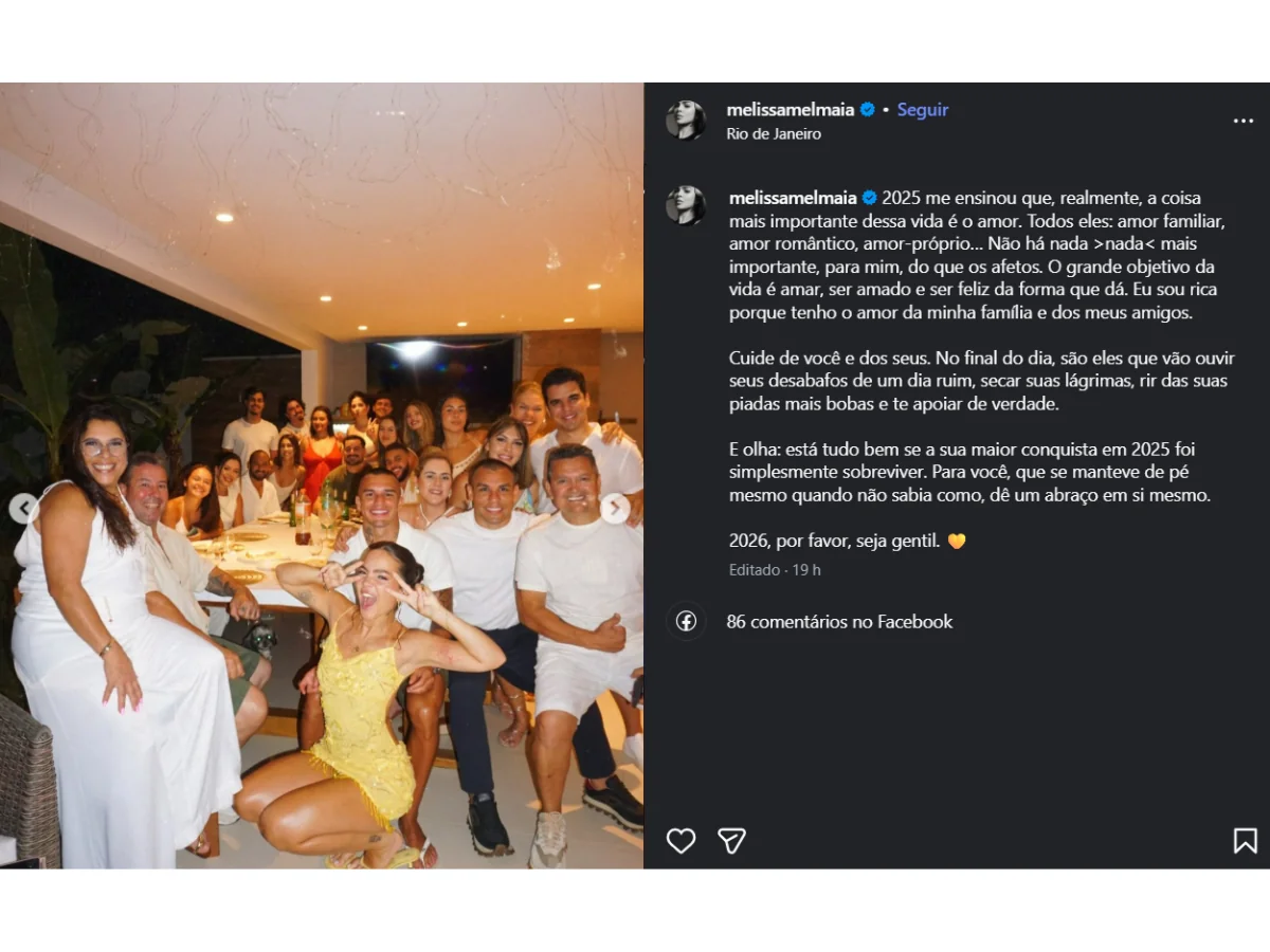No texto, Mel destacou a palavra “sobreviver”, elogiando quem permaneceu de pé mesmo sem saber como e sugeriu que 2026 seja mais gentil com todos.