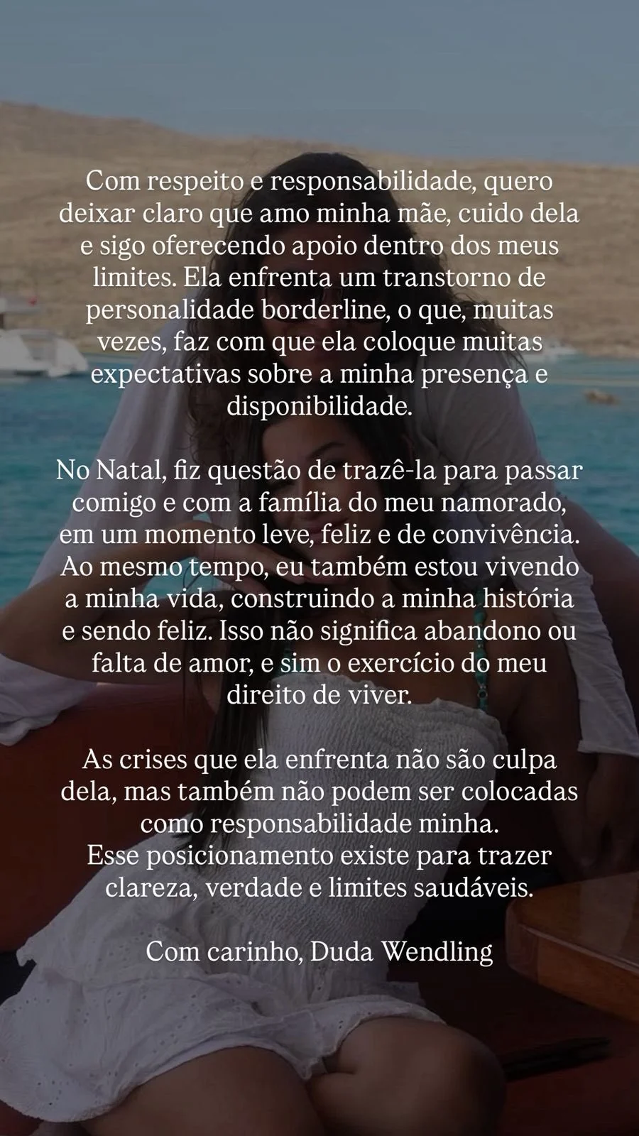 No comunicado oficial, Duda reafirmou que ama e cuida da mãe, mas enfatizou a importância de criar limites saudáveis para preservar seu bem-estar. Ela relatou que passou o Natal tanto com Camila quanto com a família do namorado, Luiz Otávio Mesquita, em um momento leve, e ressaltou que as crises de sua mãe não devem ser assumidas integralmente por ela.