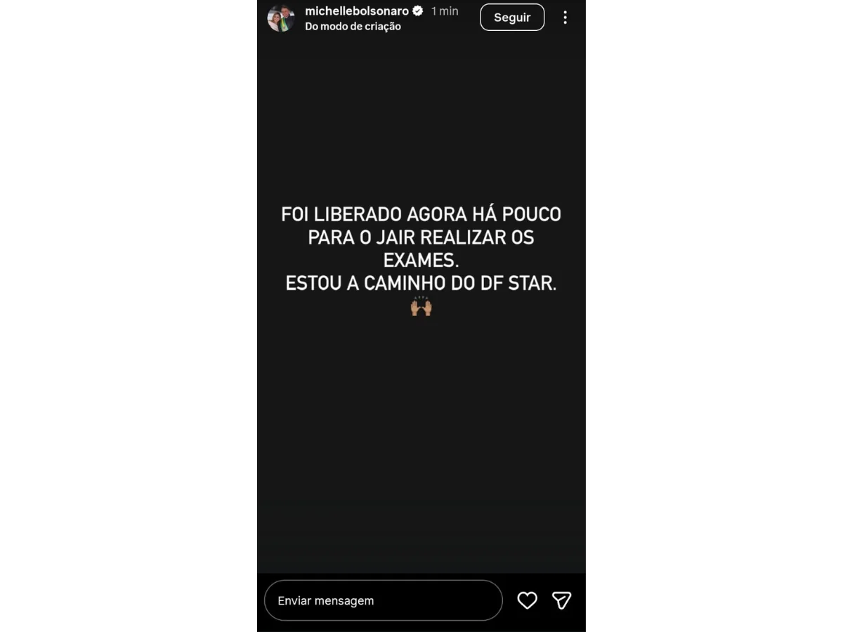 Mais cedo, ela explicou que os exames foram liberados “agora há pouco” e que já se dirigia ao DF Star. No Instagram Stories, a ex-primeira-dama afirmou que, na véspera, o marido foi impedido de fazer avaliações médicas para verificar possíveis danos neurológicos, pois ainda não havia a autorização da PGR, mesmo até as 08h56 do dia seguinte.