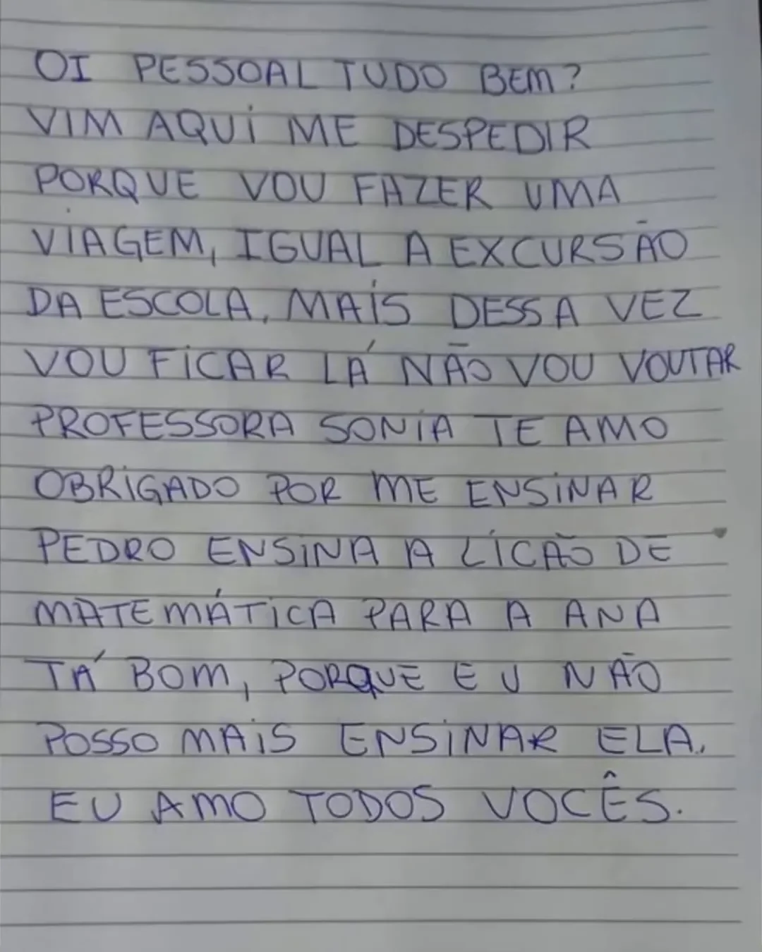 “Oi pessoal, tudo bem? Vim aqui me despedir porque vou fazer uma viagem, igual a excursão da escola, mas dessa vez vou ficar lá, não vou voltar. Professora Sonia, te amo. Obrigado por me ensinar. Pedro ensina a lição de matemática para a Ana, tá bom, porque eu não posso mais ensinar ela. Eu amo todos vocês”, escreveu.