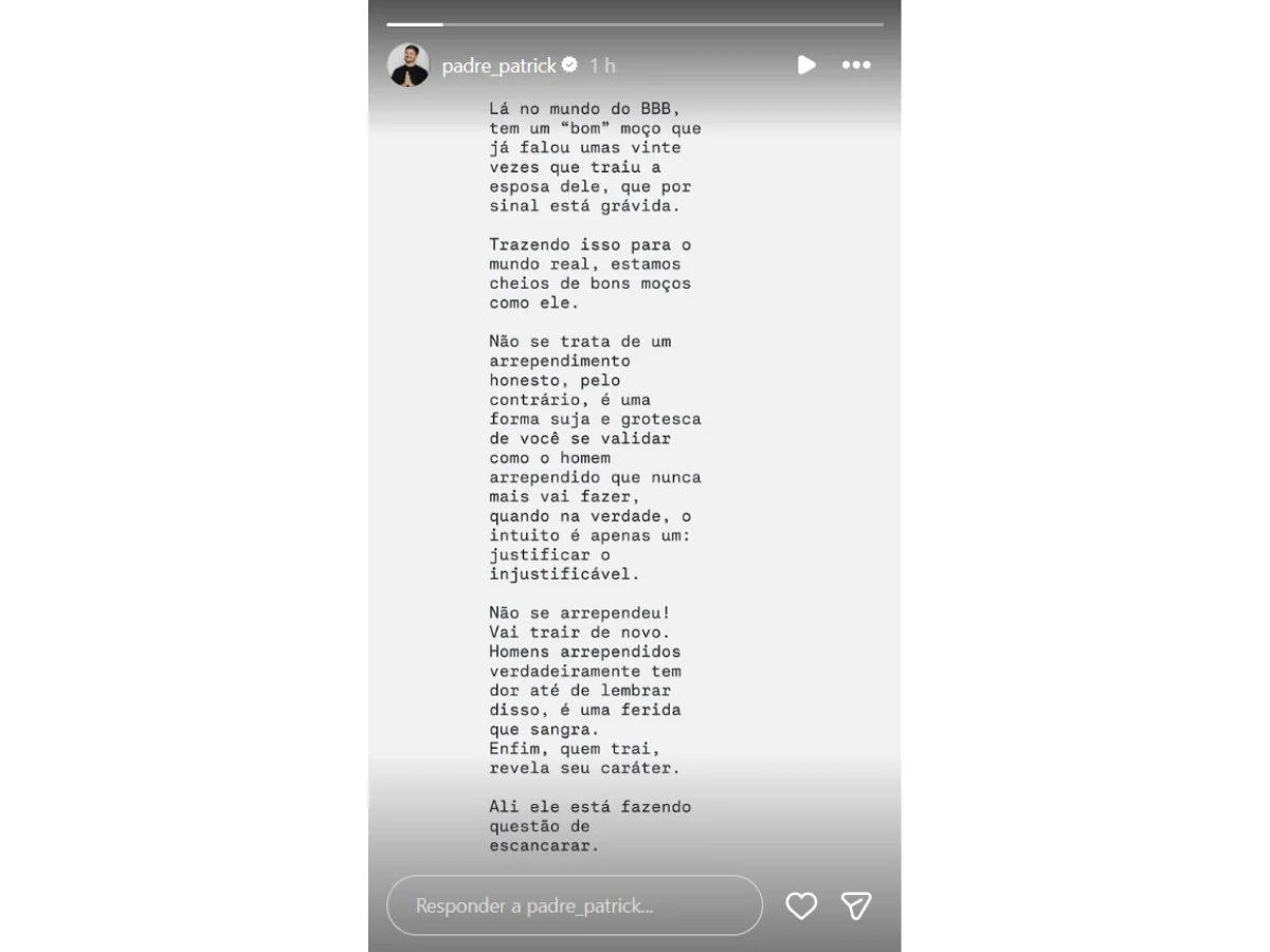 Ao iniciar sua mensagem no Instagram, o sacerdote observou: “Lá no mundo do ‘BBB’, tem um ‘bom moço’ que já falou umas vinte vezes que traiu a esposa dele, que, por sinal, está grávida. Trazendo isso para o mundo real, estamos cheios de bons moços como ele. Não se trata de um arrependimento honesto; pelo contrário, é uma forma suja e grotesca de você se validar como homem arrependido que nunca mais vai fazer, quando, na verdade, o intuito é apenas um: justificar o injustificável”.