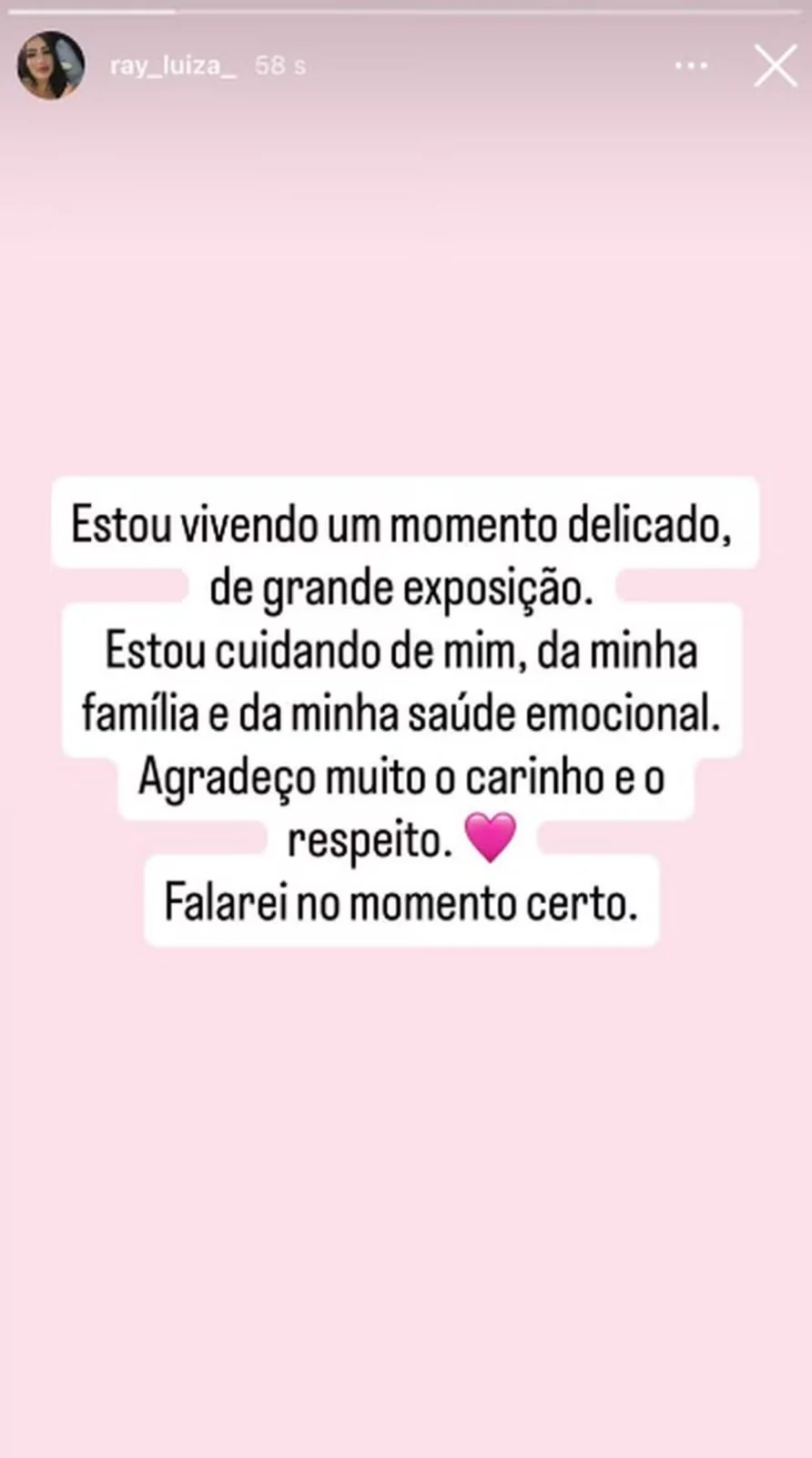 Em um breve desabafo, Rayna afirmou atravessar um período particularmente sensível de grande exposição pública. Ela ressaltou que está focada em zelar pela própria saúde emocional, bem como pelo bem-estar de sua família, em especial do bebê que espera. “Estou vivendo um momento delicado de grande exposição. Estou cuidando de mim, da minha família e da minha saúde emocional. Agradeço muito o carinho e o respeito. Falarei no momento certo”, escreveu a gestante, pedindo compreensão por não entrar em maiores detalhes neste instante.