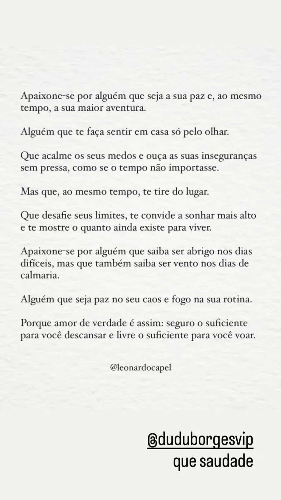 Em sua publicação, Deborah Secco trouxe um trecho que reflete valores de cumplicidade e independência: “Apaixone-se por alguém que saiba ser abrigo nos dias difíceis, mas que também saiba ser vento nos dias de calmaria. Alguém que seja paz no seu caos e fogo na sua rotina. Porque amor de verdade é assim: seguro o suficiente para você descansar e livre o suficiente para você voar”. A mensagem reforça a importância de um relacionamento equilibrado, em que confiança e liberdade caminham lado a lado.