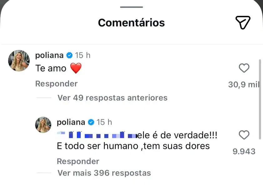 Logo após a publicação de Zé Felipe, surgiu um comentário de internauta aconselhando o cantor a não expor seus sentimentos ao “inimigo” nas redes sociais. A seguidora escreveu: “Nunca devemos mostrar nossas dores para o inimigo, espero que ele fique bem. As pessoas aqui não respeitam a dor do próximo”. Poliana Rocha leu o comentário e, sem agressividade, defendeu o filho, afirmando que toda pessoa tem o direito de expressar suas emoções.