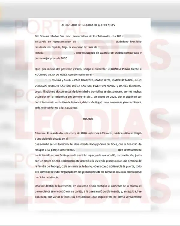 O portal LeoDias teve acesso à denúncia apresentada na Justiça espanhola contra Rodrygo Goés. No documento, o autor afirma que o jogador do Real Madrid, acompanhado de seis amigos, praticou diversos golpes contra ele, atingindo-o em diferentes partes do corpo. De acordo com a peça inicial, a agressão teria ocorrido em local particular e motivado por desentendimentos entre as partes envolvidas.