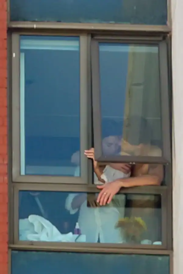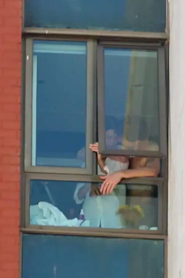 O casal também foi visto trocando carinhos na janela da cobertura em São Conrado. Enquanto o astro pop estava sem camisa, Bruna Marquezine aparecia usando uma camisa branca.