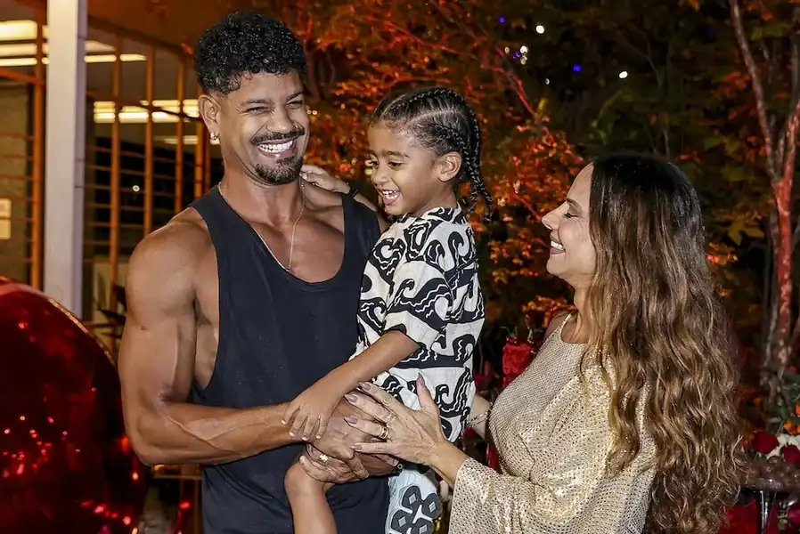 Para a ocasião, a artista escolheu um vestido dourado brilhante, combinado com sandálias de salto alto, e posou ao lado da família — com direito a beijo do marido e momentos de carinho com o filho.
