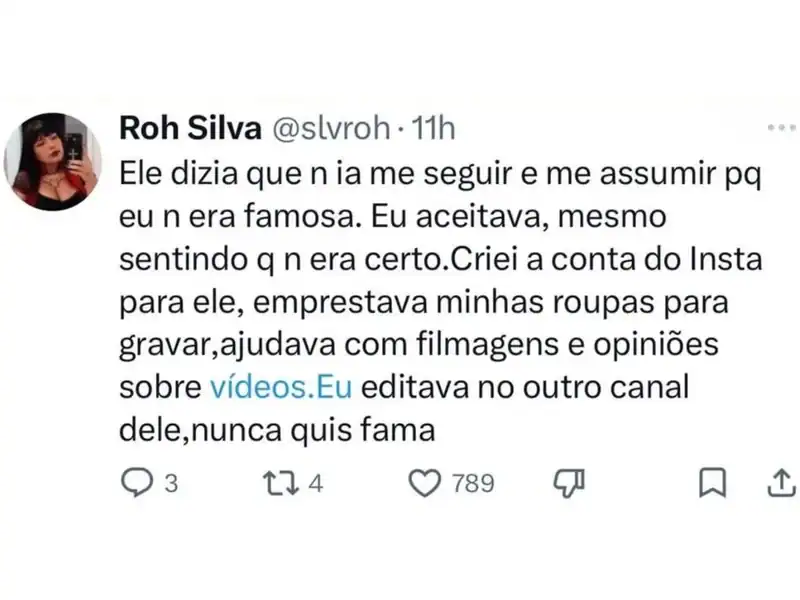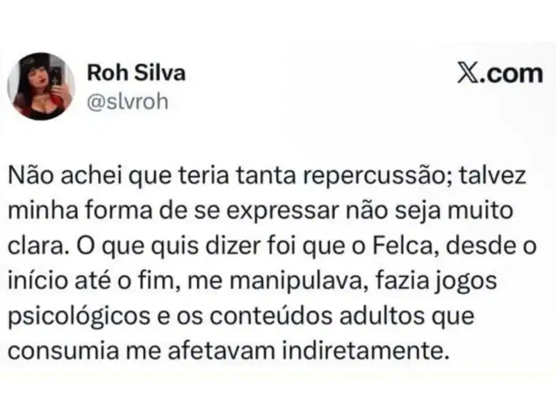 Com a repercussão, Roh voltou às redes sociais e detalhou ainda mais as acusações. Segundo ela, o relacionamento foi marcado por manipulação e constante desgaste emocional. “O Felca, desde o início até o fim, me manipulava, fazia jogos psicológicos e os conteúdos adultos que consumia me afetavam indiretamente”, relatou.