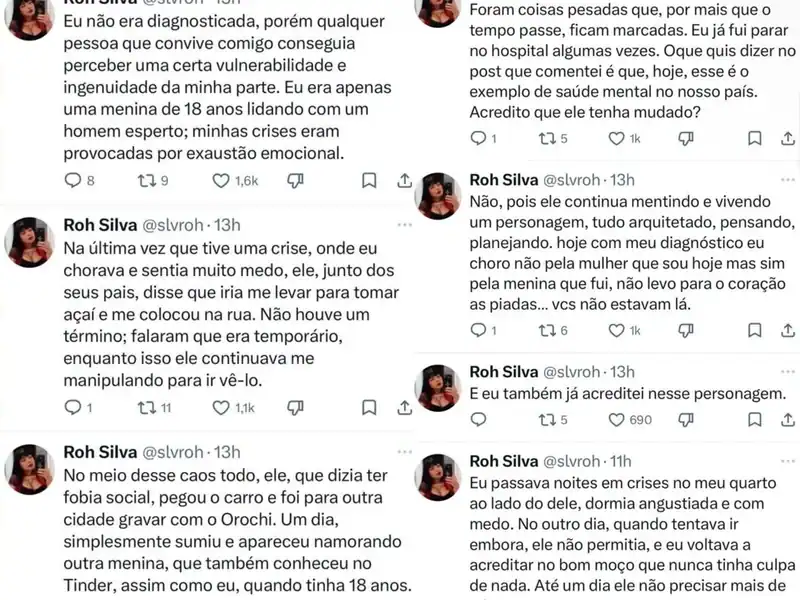 Ao encerrar o relato, Roh Silva disse que ainda enfrenta as consequências do relacionamento e revelou ter sido internada algumas vezes. Ela também criticou a imagem pública do ex-namorado. “Foram coisas pesadas que, por mais que o tempo passe, ficam marcadas. Eu já fui parar no hospital algumas vezes. O que quis dizer no post que comentei é que, hoje, esse é o exemplo de saúde mental no nosso país. Acredito que ele tenha mudado? Não, pois ele continua mentindo e vivendo um personagem, tudo arquitetado, pensando, planejando”, finalizou.