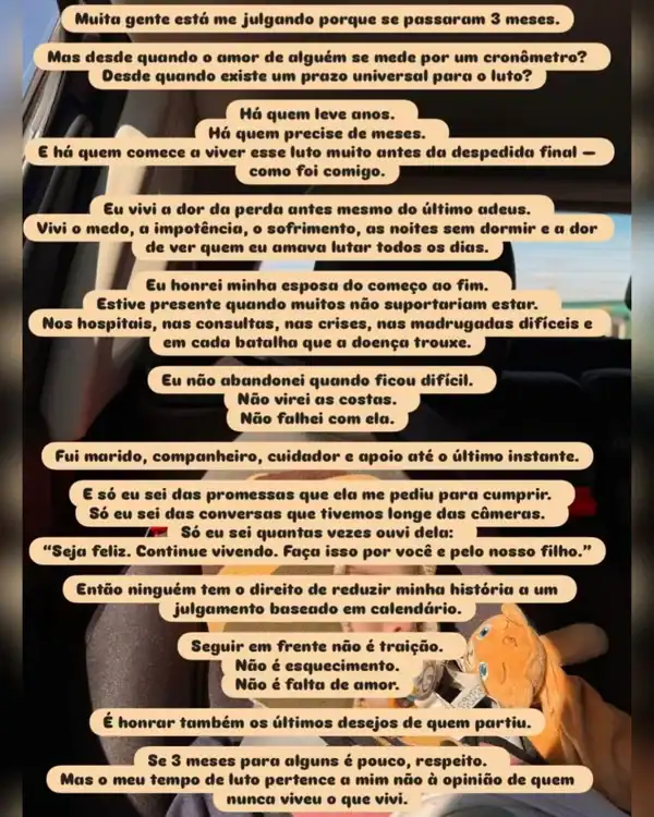 “Seguir em frente não é traição. Não é esquecimento. Não é falta de amor. É também honrar os últimos desejos de quem partiu. Se três meses para alguns é pouco, respeito. Mas o meu tempo de luto pertence a mim, não à opinião de quem nunca passou pelo que vivi”, concluiu Lucas.