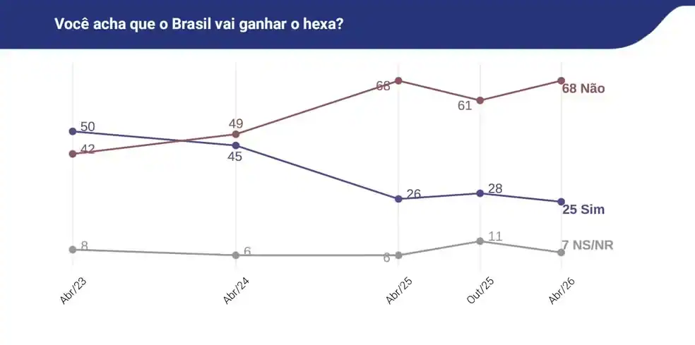 Considerando o histórico de levantamentos, este foi o resultado mais pessimista desde que o instituto começou a analisar o tema, em abril de 2023. O percentual de 68% de descrentes é igual ao registrado em abril de 2025, mas naquela ocasião 26% acreditavam na conquista.