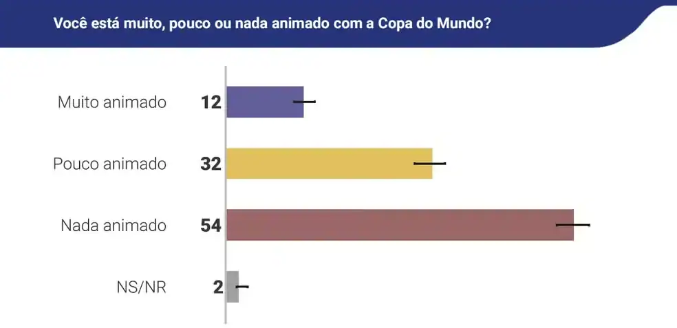 Outro dado revelado pela pesquisa deste ano é o nível de empolgação para a Copa do Mundo. Apenas 12% dos entrevistados disseram estar “muito animados”, enquanto 32% afirmaram estar “pouco animados” e 54% “nada animados”.