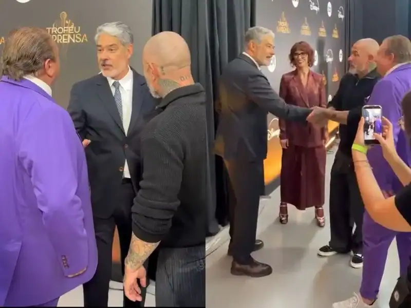 Durante os bastidores do Troféu Imprensa, realizado no SBT, um momento inesperado marcou a aproximação entre nomes da Globo e da Band. Representando a emissora carioca na premiação, William Bonner se encontrou com o trio de jurados do “MasterChef Brasil” – Henrique Fogaça, Erick Jacquin e Helena Rizzo – e o que aconteceu foi uma conversa de respeito e admiração mútua.