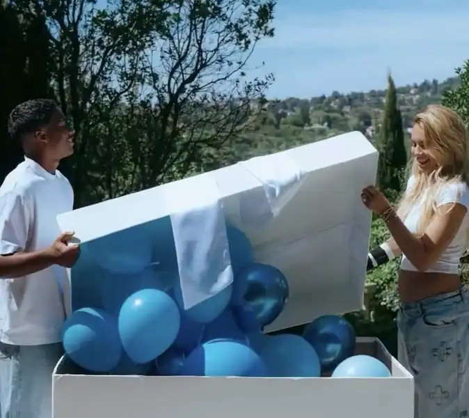 Ao abrirem uma caixa, balões azuis surgiram e confirmaram que o casal espera um menino. O nome do bebê ainda não foi divulgado.