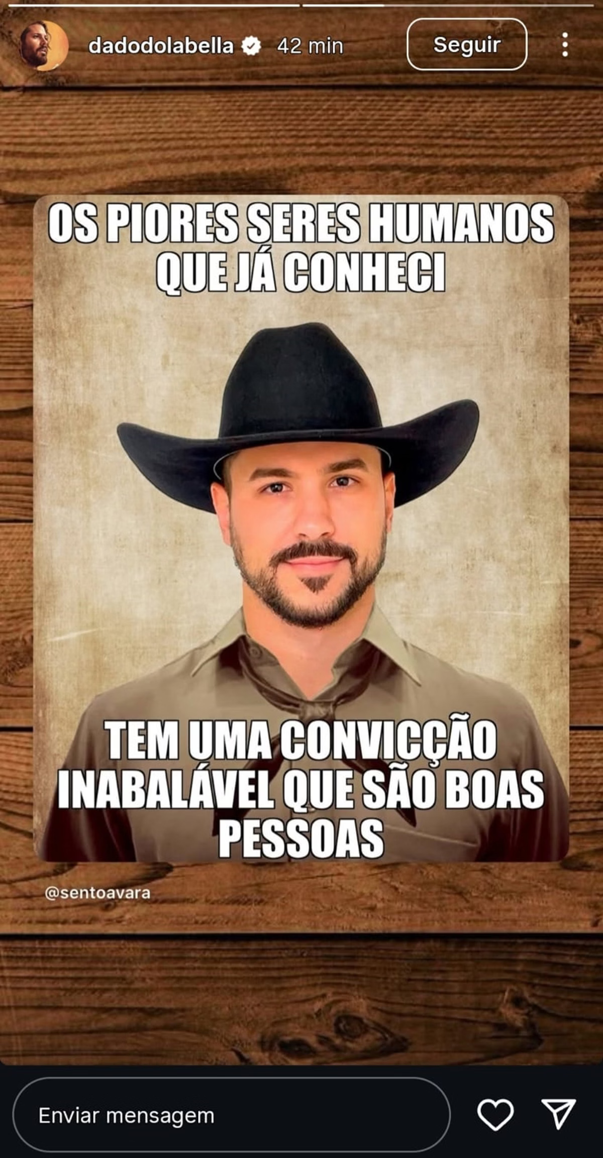 A situação escalou quando Luan publicou vídeos e mensagens acusando Dado de ser um “agressor de mulher” e revelou ter sido bloqueado pelo ator nas redes sociais. Em contrapartida, Dado publicou uma imagem enigmática nos stories, com a legenda: “Os piores seres humanos que já conheci têm uma convicção inabalável que são boas pessoas”, o que foi interpretado como uma indireta ao cantor sertanejo.