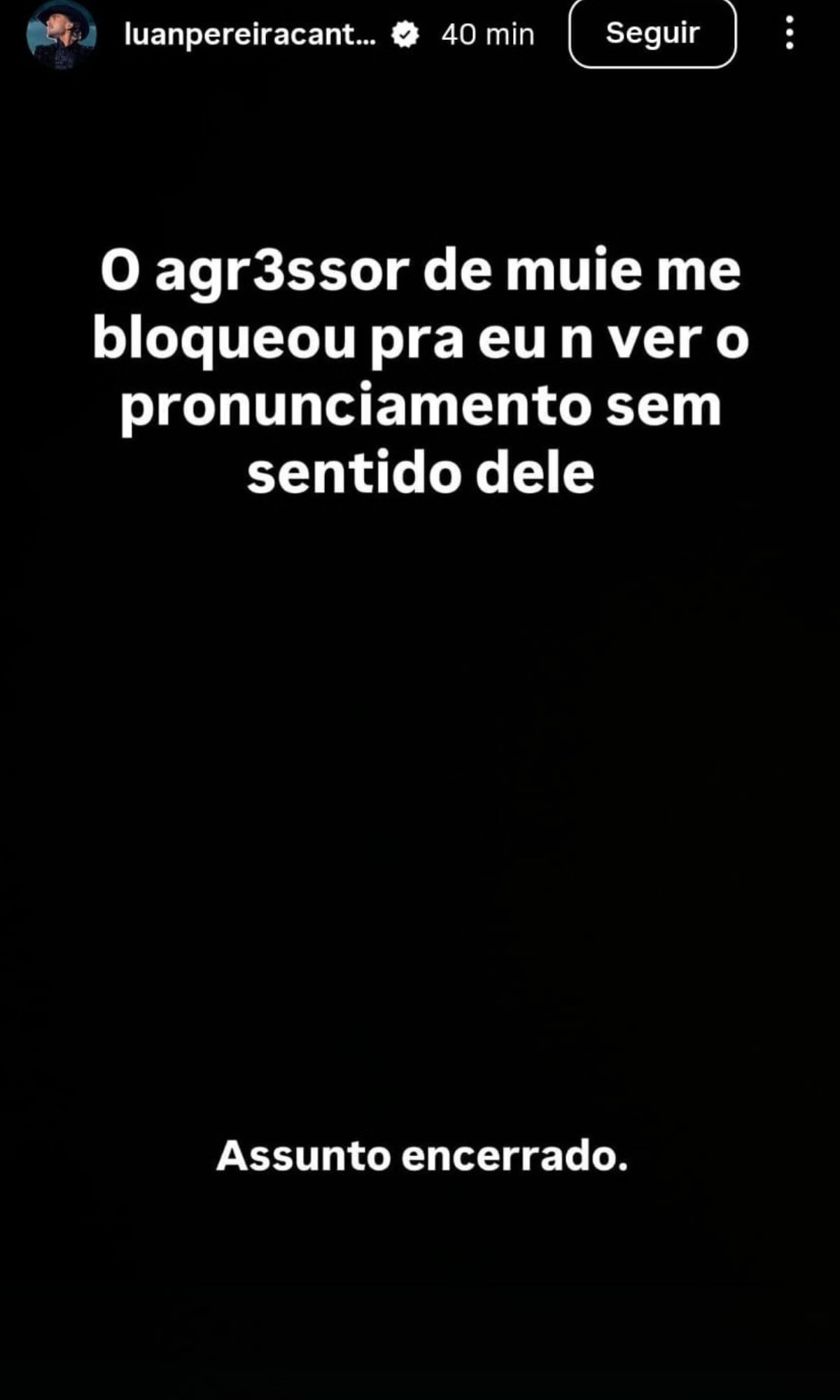 O caso repercutiu nas redes sociais e dividiu opiniões. Enquanto Dado tenta minimizar o ocorrido como um erro de julgamento, Luan mantém o tom crítico e reafirma sua versão dos fatos, encerrando o assunto com a frase: “O agressor de mulher me bloqueou para eu não ver o pronunciamento sem sentido dele. Assunto encerrado”.