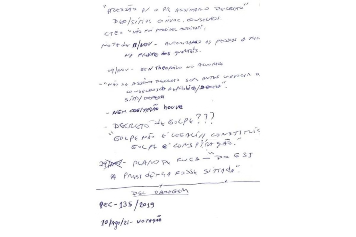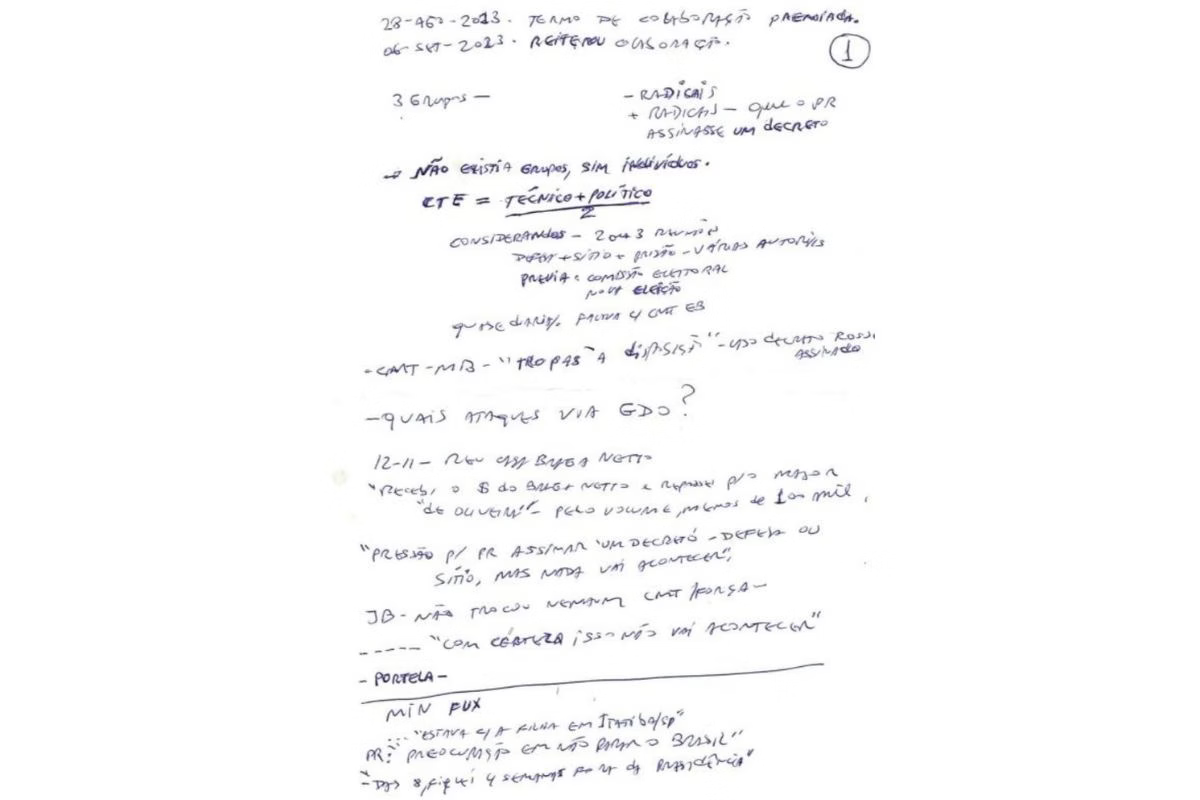 As anotações sugerem que foram feitas durante o interrogatório de Cid no STF, em junho, e demonstram preocupação com a repercussão da delação. Expressões como “Min Fux”, “Preocupação em não parar o Brasil” e “Plano de fuga – do GSI” aparecem entre os rabiscos.