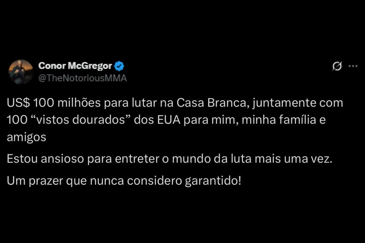 Apesar da empolgação dos fãs com a possível participação do irlandês, sua presença ainda não foi confirmada. Isso porque McGregor impôs exigências rigorosas para aceitar o convite, incluindo um pagamento de US$ 100 milhões (cerca de R$ 535 milhões) e a liberação de 100 vistos especiais de entrada nos EUA, que ele denominou de “Vistos Dourados”.
