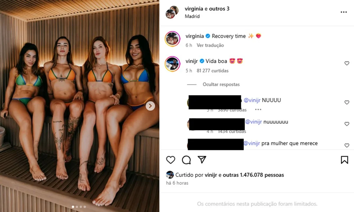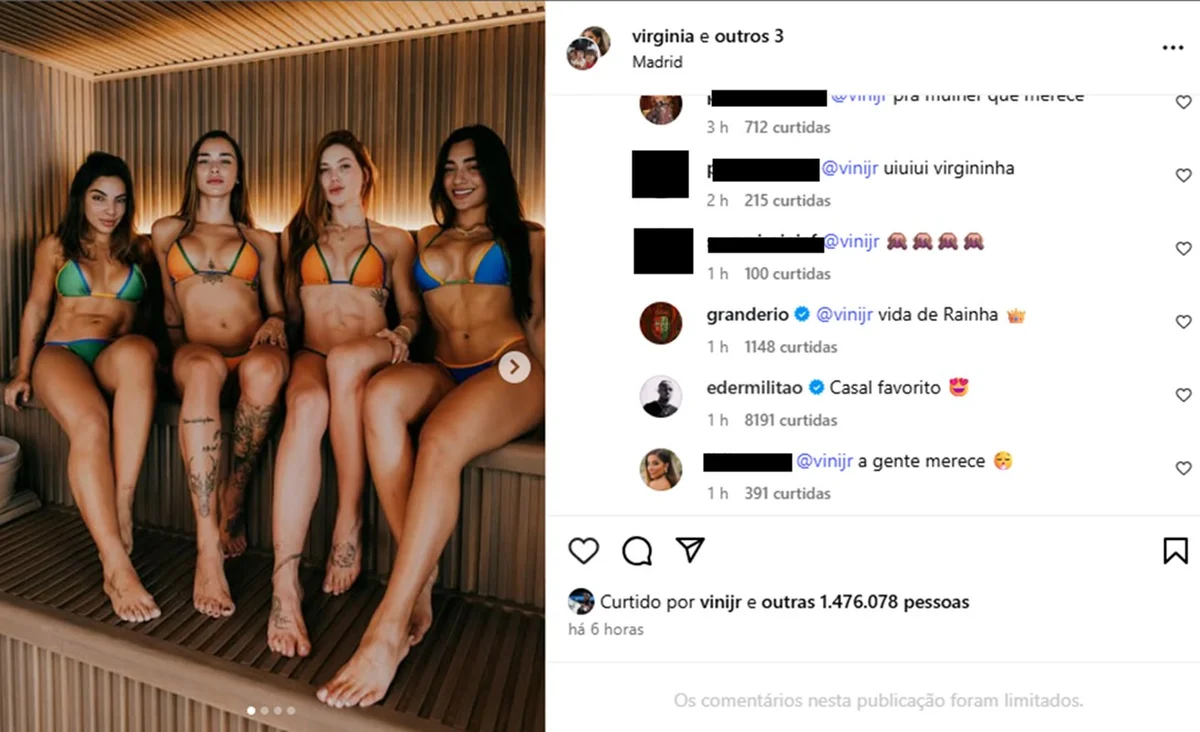 Após muitas especulações, um comentário de Éder Militão nas redes sociais pode ter sido a confirmação do relacionamento entre Virginia Fonseca e Vini Jr. A influenciadora digital está na Espanha e compartilhou uma foto em uma sauna com amigas, incluindo Tainá Militão. A publicação recebeu uma resposta carinhosa do atacante do Real Madrid, o que aumentou ainda mais os rumores.