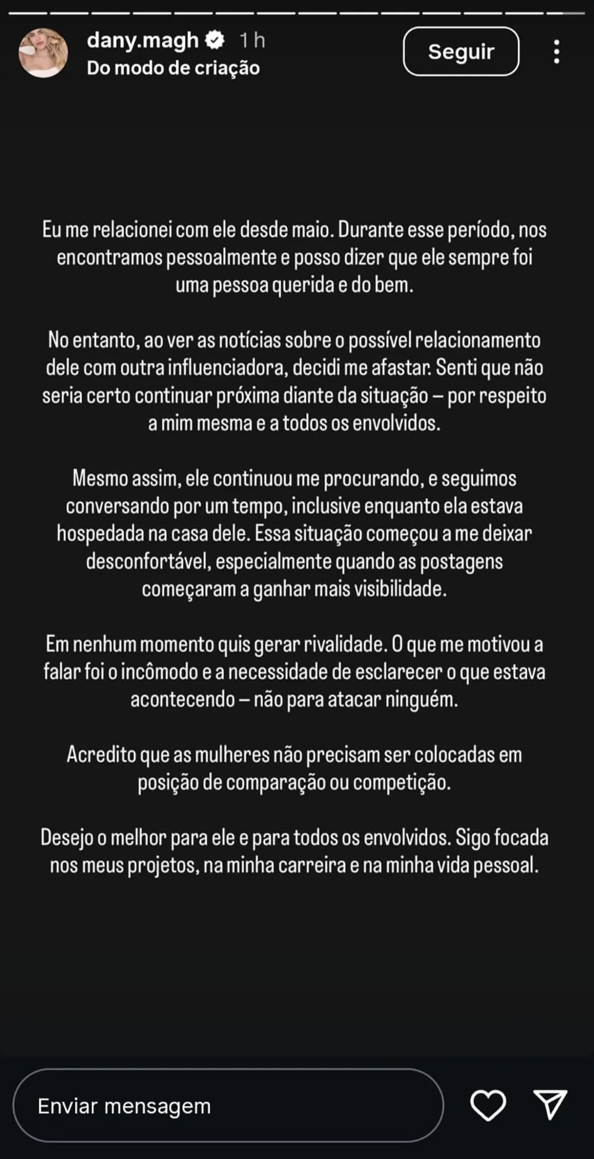 Ela enfatizou que não há mais espaço para diálogo com o jogador e que está seguindo sua vida. Ao comentar sobre a repercussão do caso, explicou que precisa de tempo para processar tudo o que aconteceu, mas reforçou que não há possibilidade de reconciliação.