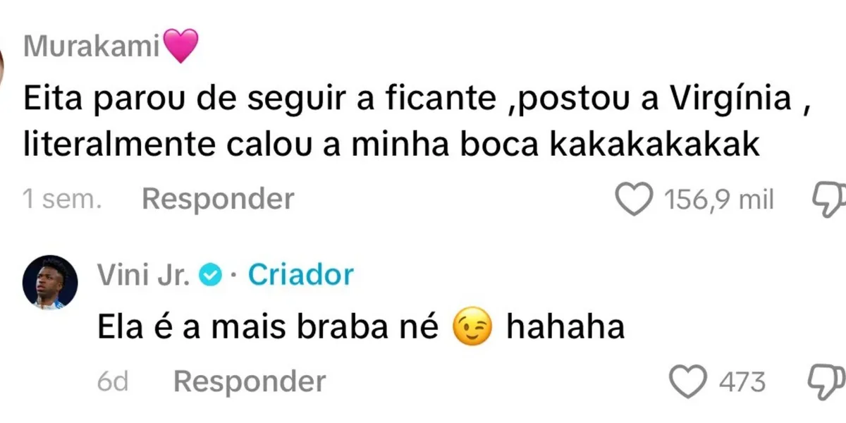 Na publicação, uma internauta comentou sobre o antigo relacionamento entre os dois, dizendo: “Eita, parou de seguir a ficante, postou a Virginia, literalmente calou a minha boca [risos]”. Para surpresa dos fãs, Vini Jr. respondeu: “Ela é a mais braba, né?”, usando um emoji piscando e risadas, o que gerou grande repercussão.