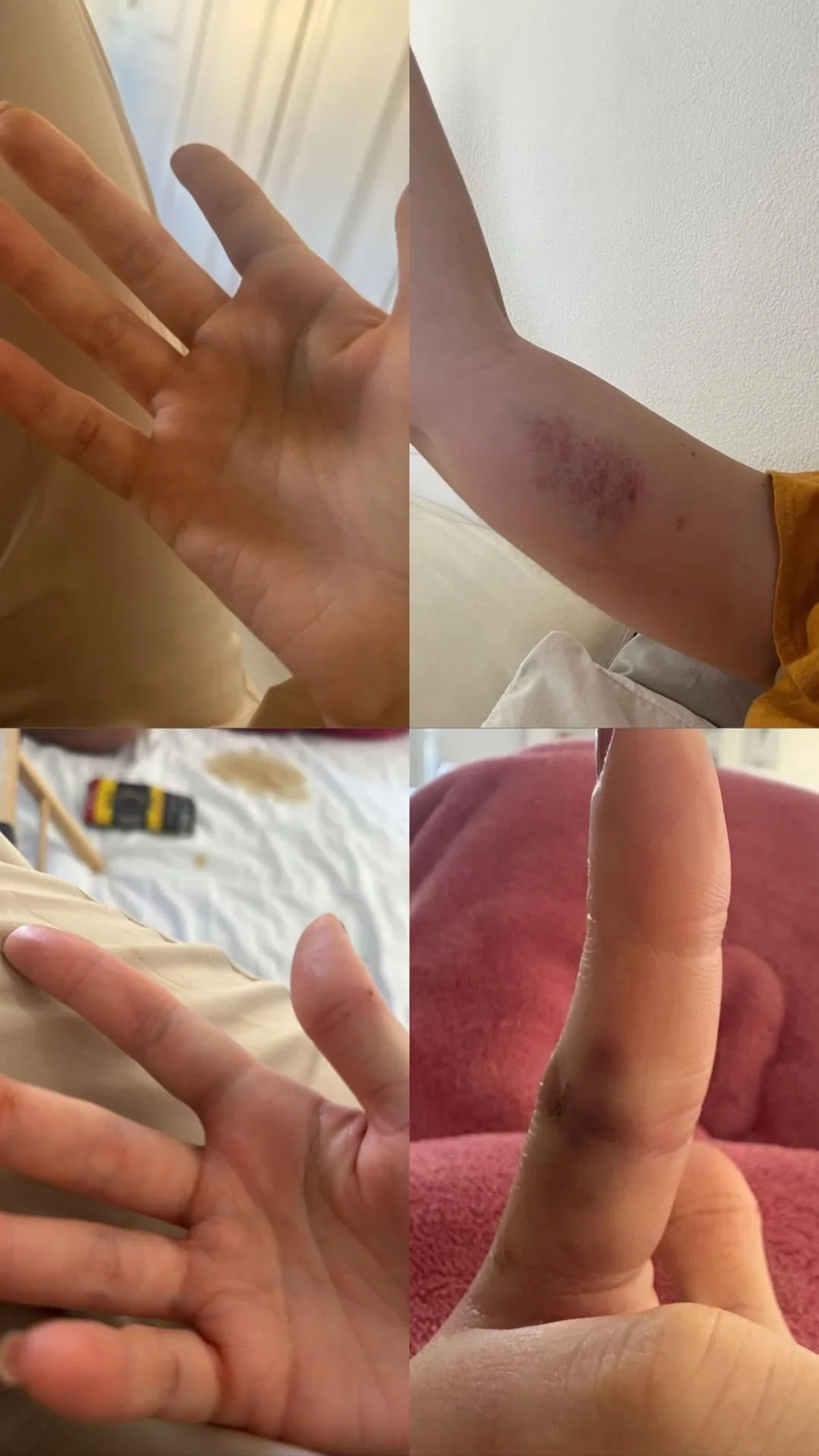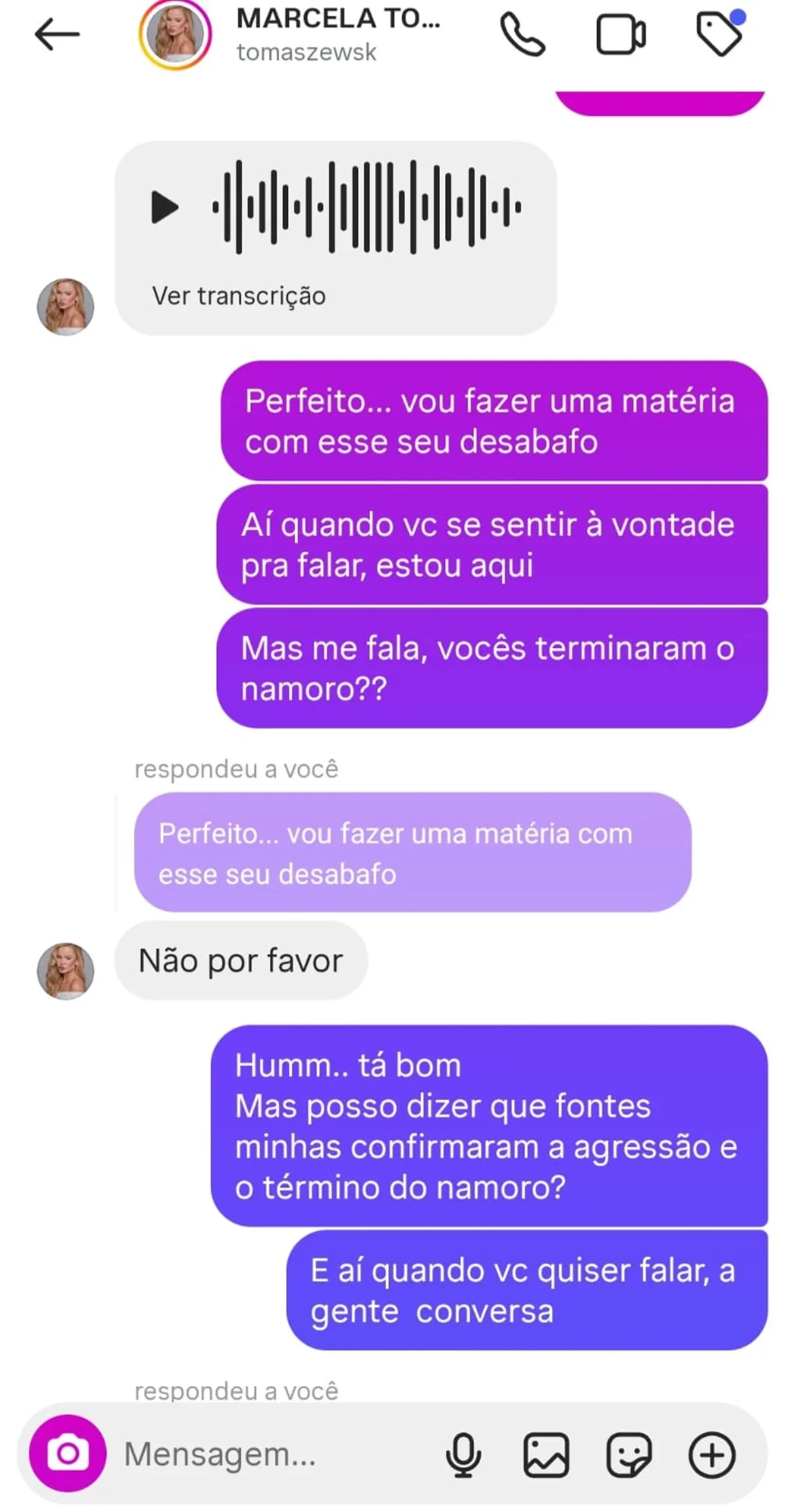 Nas postagens, Rafa chamou o ator de “agressor” e revelou ter sido bloqueada por Marcela após tentar convencê-la a apagar stories em que negava a violência. As fotos mostram a modelo com marcas visíveis pelo corpo, como pescoço avermelhado e machucados na mão.