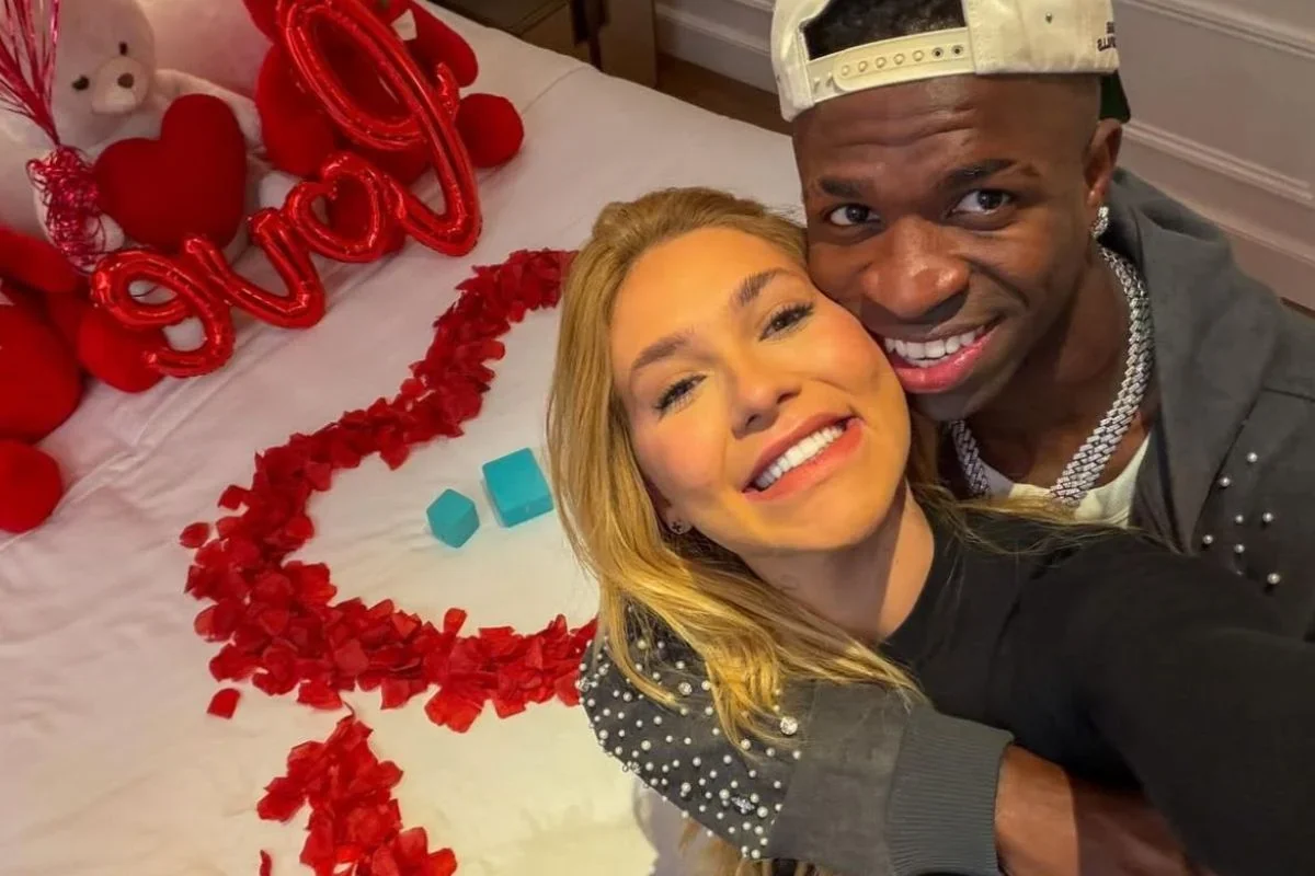 A oficialização do namoro veio após semanas de especulações. Vini Jr. preparou um pedido romântico com direito a joias, balões, flores em formato de coração e a palavra “love” em destaque. A surpresa foi registrada em fotos que circularam amplamente nas redes.