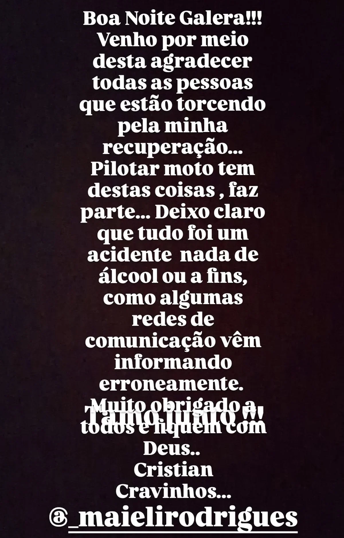 Nos stories do Instagram, Cravinhos, que é ex-cunhado de Suzane von Richthofen, desabafou sobre o ocorrido, dizendo que situações como essa são comuns para quem pilota motos. Ele demonstrou gratidão pelas mensagens de carinho e reforçou que está se recuperando bem.