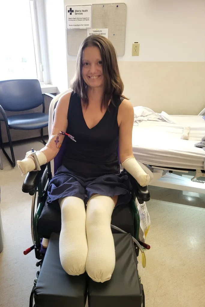A infecção resultou em necrose severa nos membros: suas mãos e pés escureceram, apresentando sinais de decomposição e perda de tecido. Por isso, os médicos decidiram amputar as quatro extremidades, começando pelas mãos e depois as pernas, abaixo dos joelhos.