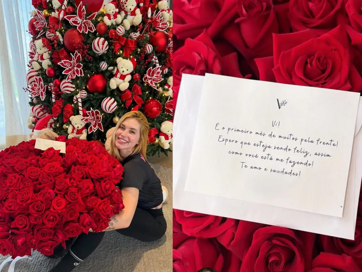 O casal Virginia Fonseca e Vinicius Júnior celebrou nesta sexta-feira (28/11) o primeiro mês de namoro com muito romantismo. Para marcar a data especial, o jogador de futebol surpreendeu a influenciadora com um gigantesco buquê de rosas entregue em sua casa. Além do gesto, Vini Jr. também se declarou publicamente nas redes sociais, postando uma foto ao lado de Virginia em um jantar íntimo, realizado antes mesmo de assumirem oficialmente o relacionamento. Na imagem, os dois aparecem juntos em um restaurante, com o jogador abraçando Virginia e sorrindo, enquanto ela posa segurando sua mão discretamente.