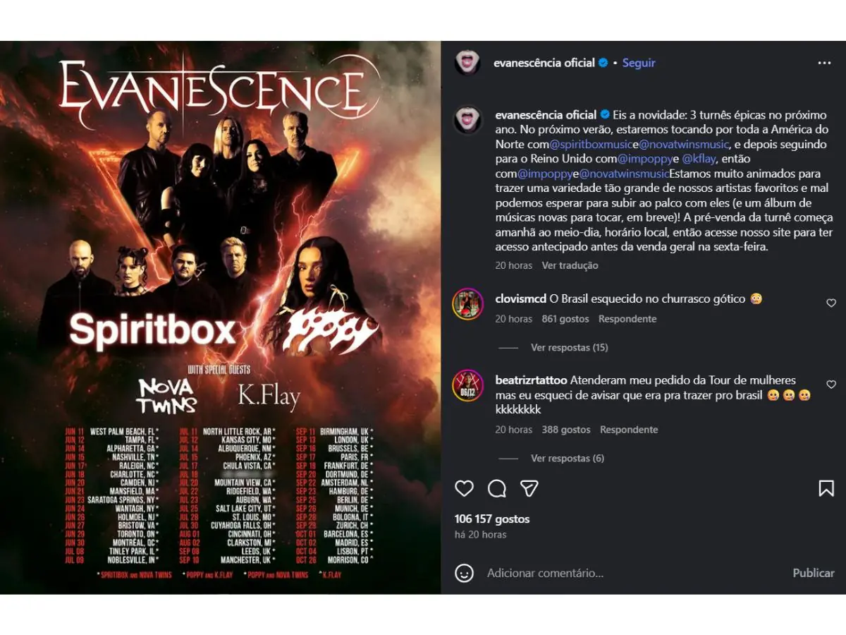 A banda Evanescence anunciou oficialmente, por meio de suas redes sociais, uma nova turnê mundial programada para 2026. A série de shows terá início em 11 de junho em West Palm Beach, na Flórida (EUA), e se encerrará no icônico Red Rocks Amphitheatre, no Colorado. A novidade foi divulgada na última segunda-feira (1º/12), empolgando fãs ao redor do mundo.