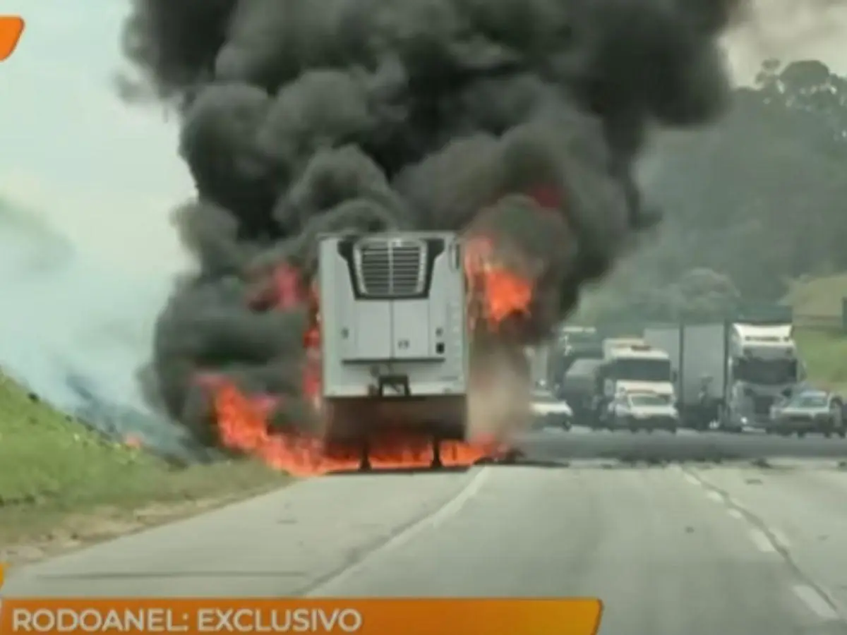Uma carreta frigorífica que transportava alimentos explodiu após tombar no Rodoanel Mário Covas, na altura de Osasco (SP), por volta do meio-dia desta quarta-feira (3/12). O incidente começou quando o motorista percebeu fumaça na parte traseira do veículo. Ele tentou conter o princípio de incêndio com um extintor, mas as chamas se alastraram rapidamente, resultando em explosões.