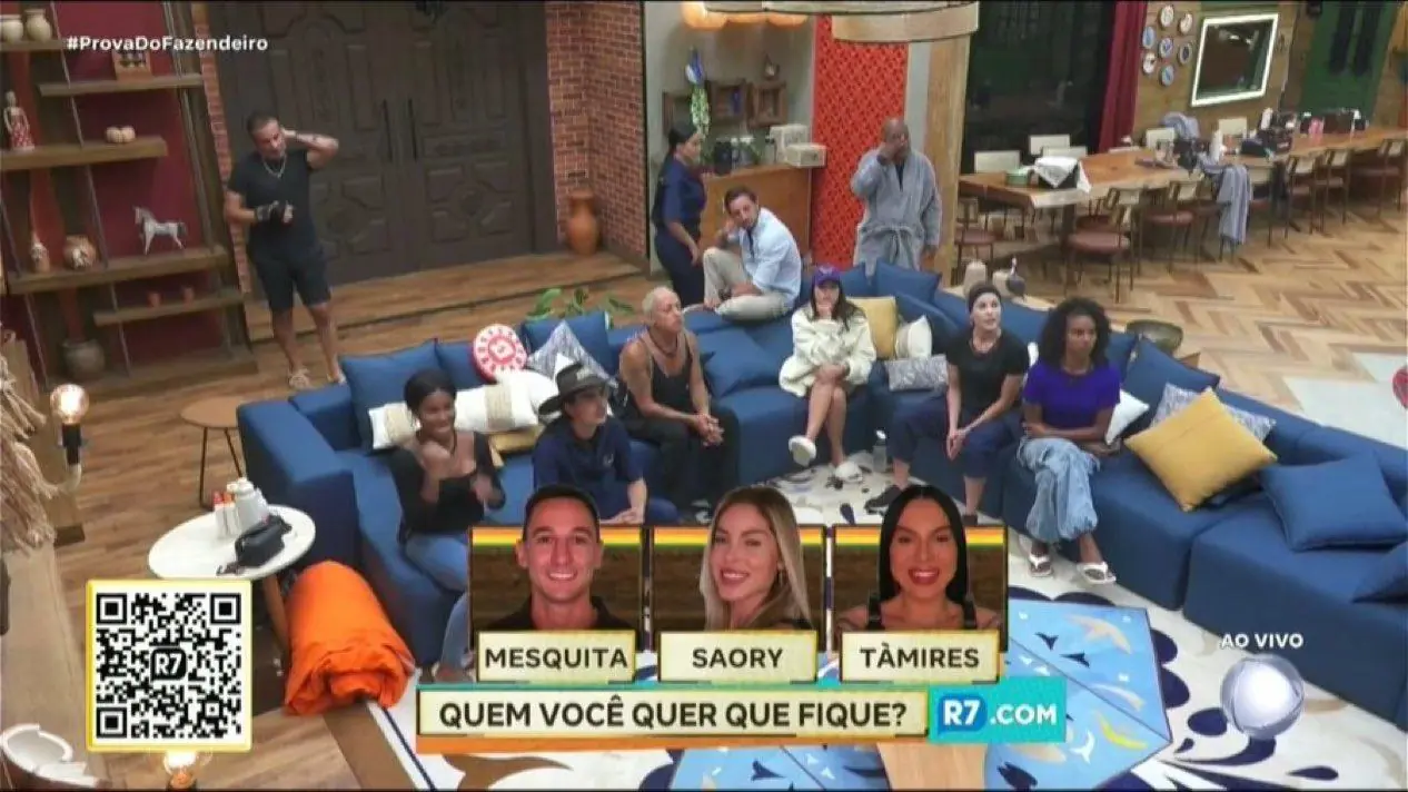 Enquanto Dudu comemorava, o clima na casa era de tensão extrema. A formação da 11ª Roça colocou Saory, Tàmires e Luiz Mesquita na berlinda. Mesquita foi vetado por Carol Lekker e, sem direito a competir, foi automaticamente indicado. A prova foi simbólica para eles, que assistiram à disputa de Dudu enquanto aguardavam a decisão do público.