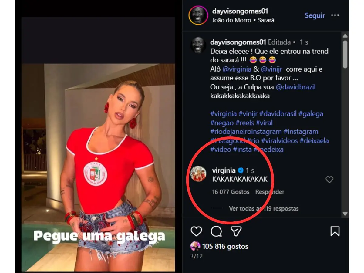 No vídeo publicado por Dayvison no Instagram, imagens de Virginia e Vini Jr. são exibidas enquanto a música toca. Na legenda, ele brinca: “Deixa eleeee! Que ele entrou na trend do sarará !!! Alô, Virginia e Vini, corre aqui e assume esse B.O por favor… Ou seja, a culpa é sua, David Brazil kakakkakakakkaaka”. A publicação viralizou rapidamente nas redes sociais.