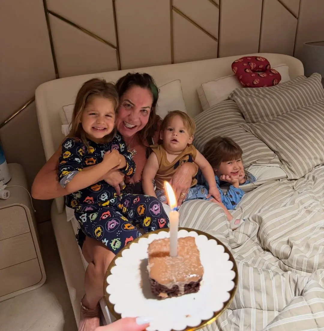A aniversariante também foi surpreendida logo cedo pela filha Virginia e pelos netos Maria Alice, Maria Flor e José Leonardo. As crianças acordaram a avó com parabéns e muita animação, pulando em sua cama. A comemoração deve continuar com uma festa em família e uma viagem já programada.