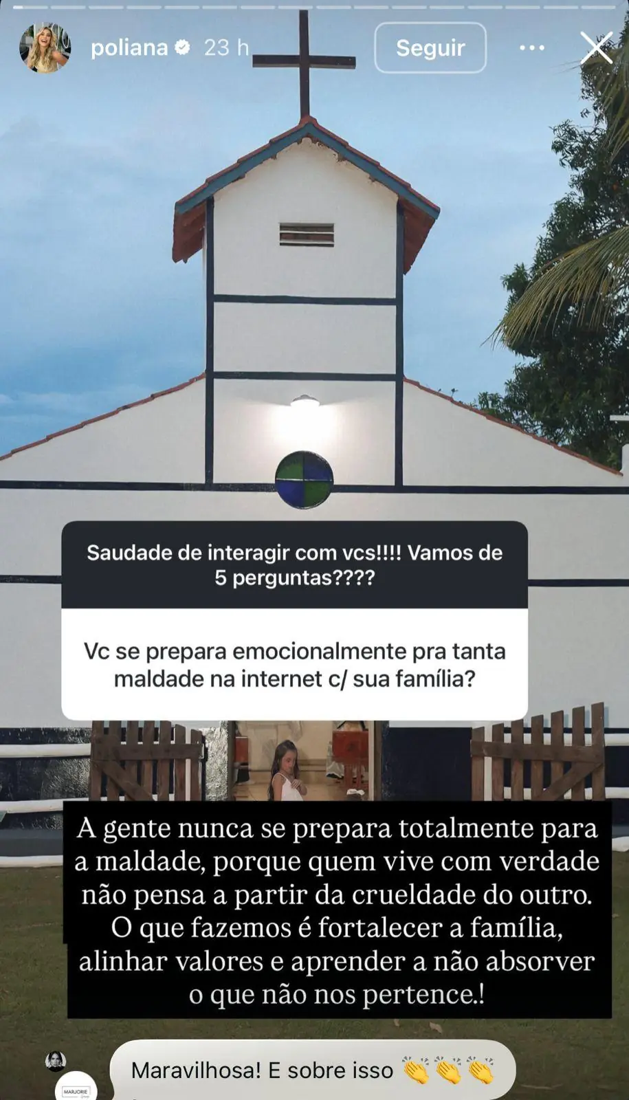 Segundo ela, o segredo está em fortalecer os laços familiares e alinhar os valores dentro de casa. “Quem vive com verdade não pensa a partir da crueldade do outro”, declarou. Poliana explicou que, ao invés de se abalar com julgamentos, prefere focar no que realmente importa: a união e os princípios da família.