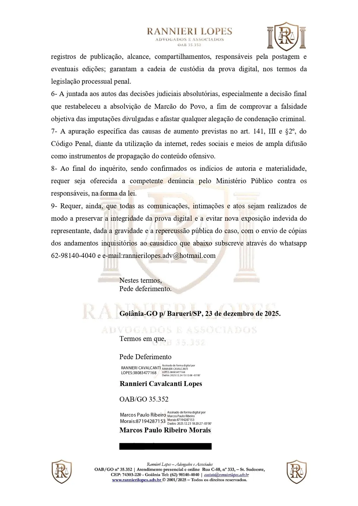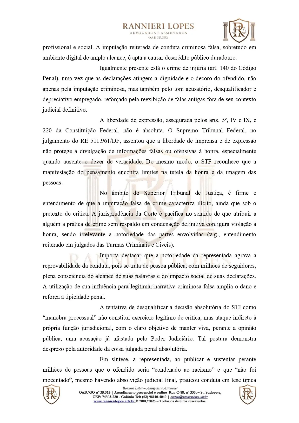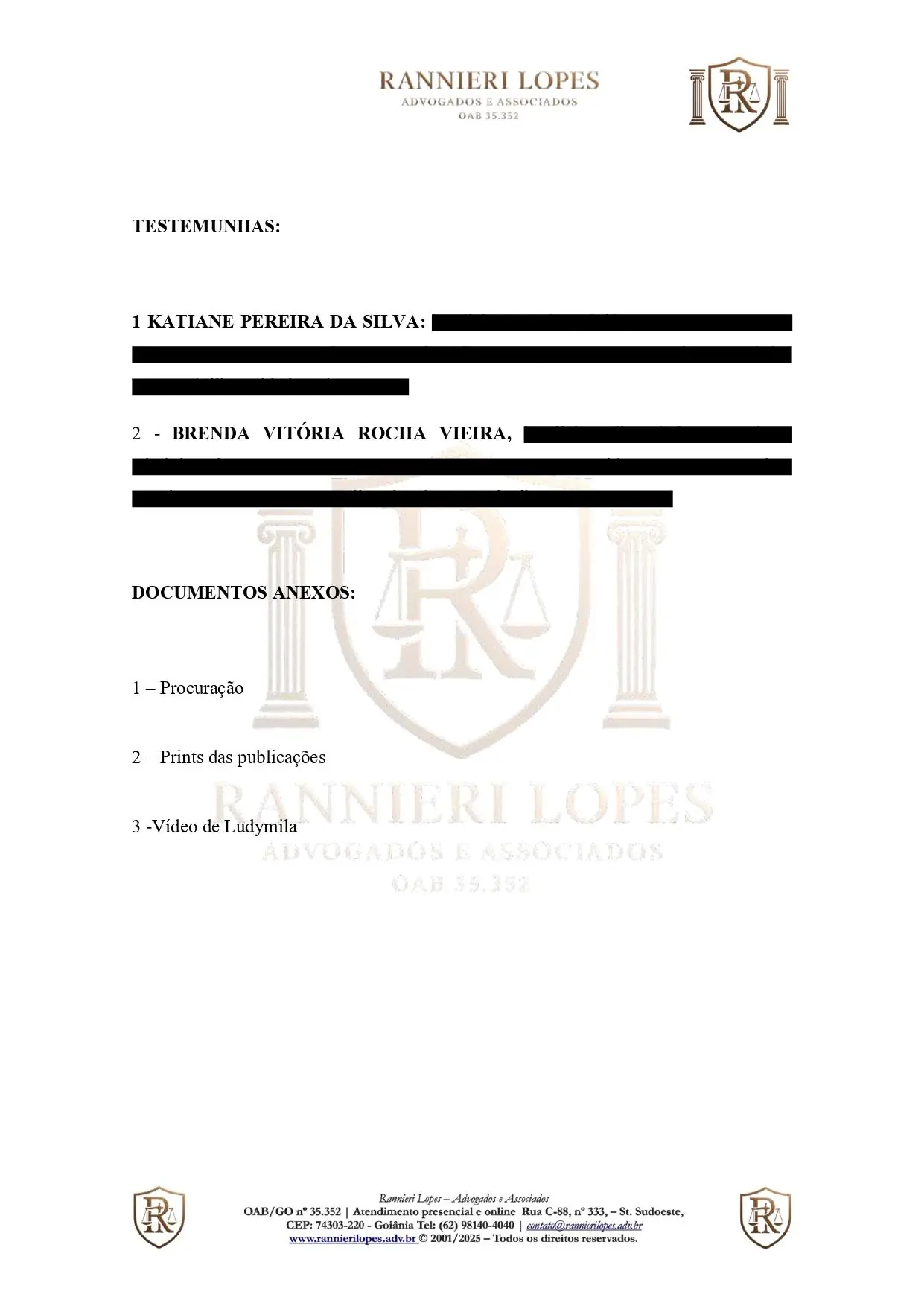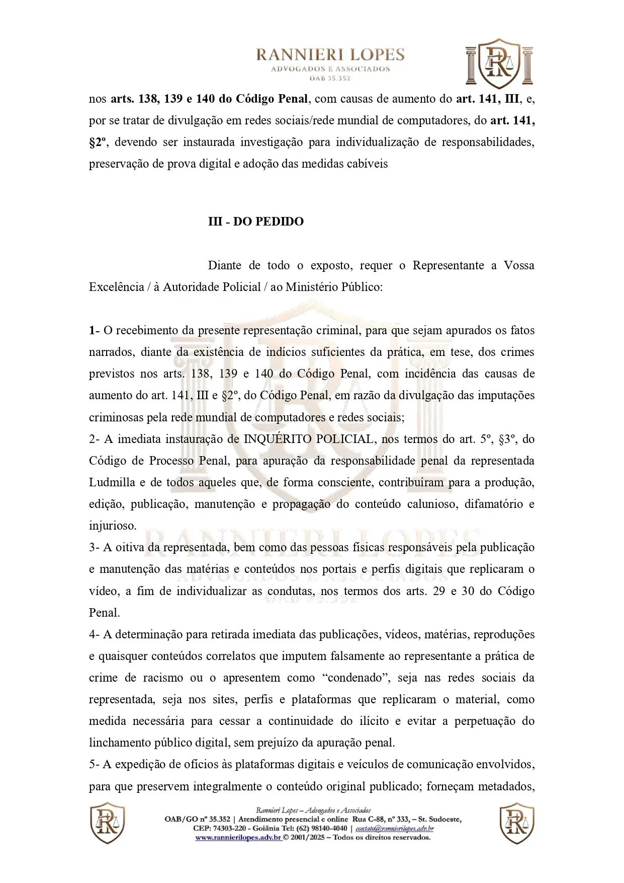 A representação ainda acusa Ludmilla de calúnia, difamação e injúria, e solicita medidas para evitar o “linchamento público digital” decorrente da divulgação repetida do conteúdo considerado calunioso.
