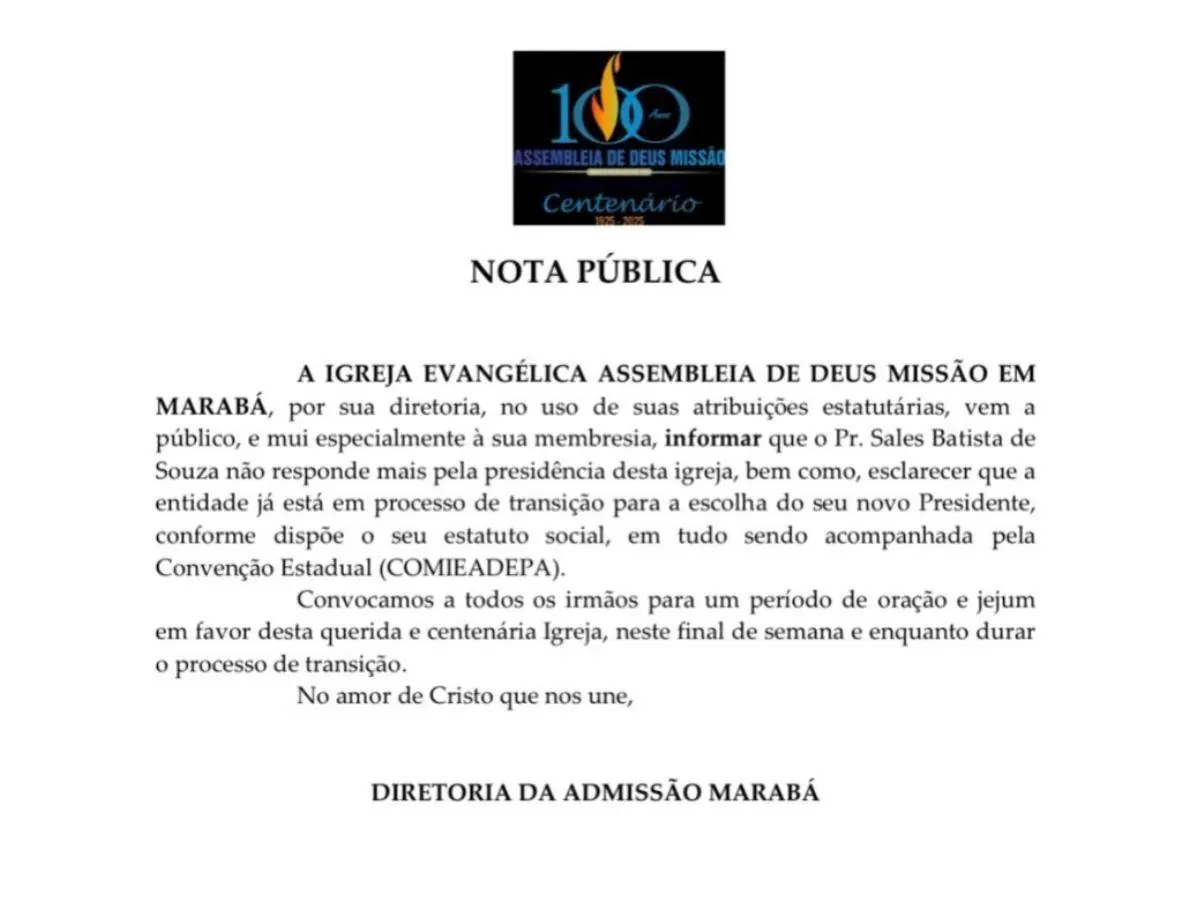 Na sexta-feira (26/12), a diretoria publicou nota informando que Sales não ocupa mais o cargo de presidente e que a transição de liderança está em curso, sob supervisão da Convenção Estadual (COMIEADEPA). Os fiéis foram convocados a orar e jejuar em favor da instituição centenária.